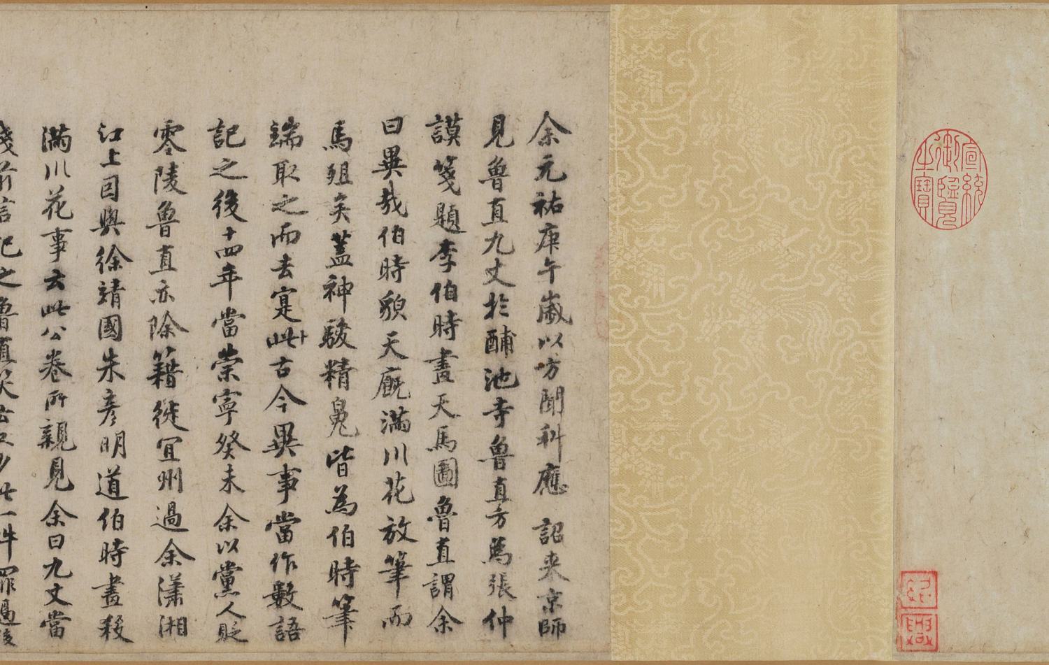 余元祐庚午歲,以方聞科應詔來京師,見魯直九丈於酺池寺。魯直方為張仲謨箋題李伯時畫天馬圖。魯直謂余曰:異哉!伯時貌天廄滿川花,放筆而馬殂矣。蓋神駿精魄,皆為伯時筆端取之而去,實古今異事。當作數語記之。後十四年,當崇寧癸未,余以黨人貶零陵,魯直亦除籍徙宜州,過余瀟湘江上,因與徐靖國、朱彥明道伯時畫殺滿川花事,雲此公卷所親見。余曰:九丈當踐前言記之。魯直笑云:只少此一件罪過。後二年,魯直死貶所。又廿七年,余將漕二浙,當紹興。辛亥至嘉禾,與梁仲謨、吳德素、張元覽汎舟訪劉延仲於真如寺,延仲遽出是圖,開卷錯愕,宛然疇昔。拊事念往,逾四十年憂患餘生,巍然獨在,彷徨弔影,殆若異身也。因詳敘本末,不特使來者知伯時一段異事,亦魯直遺意。且以玉軸遺延仲,俾重加裝飾雲。空青曾紆公卷書
