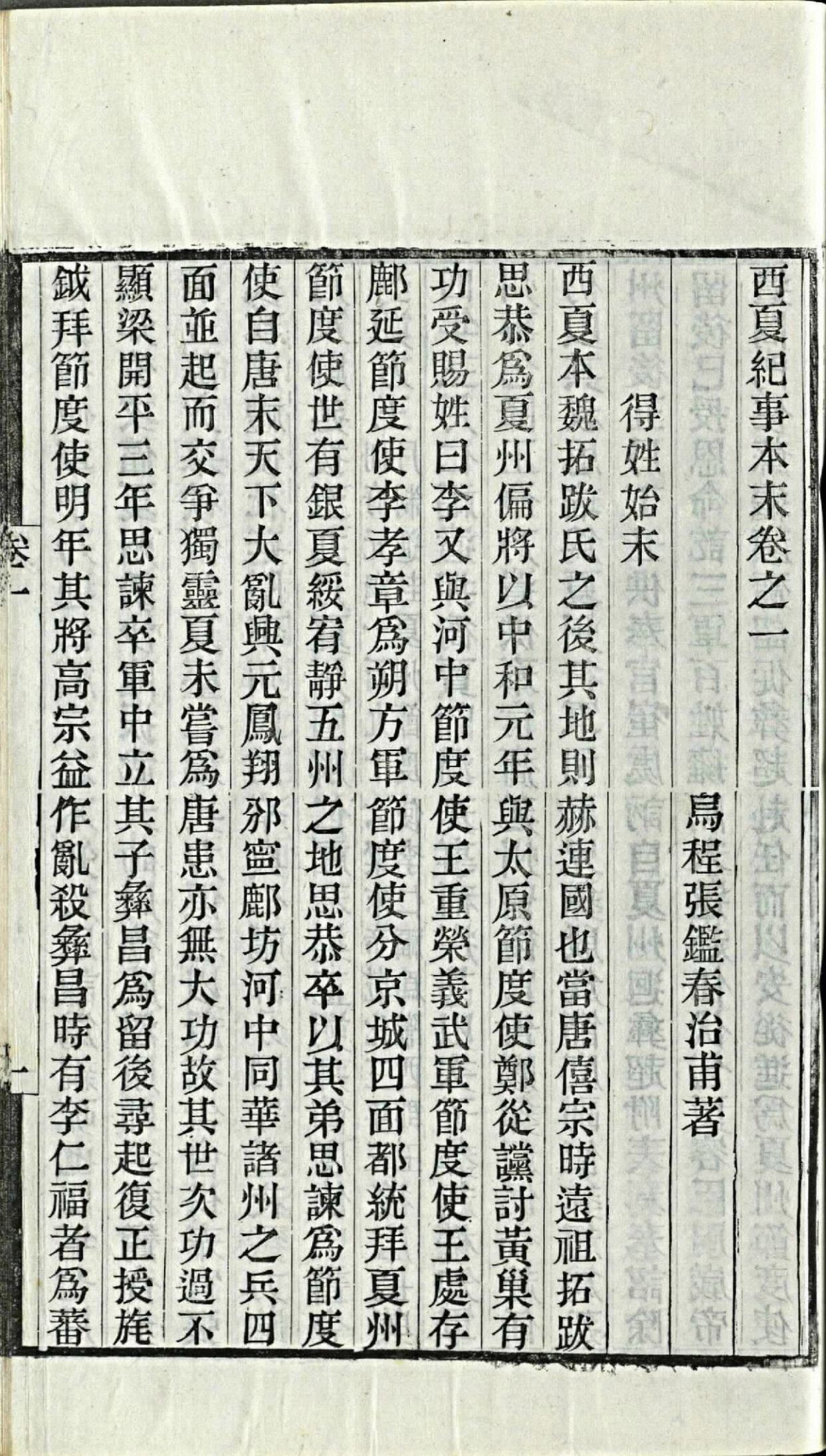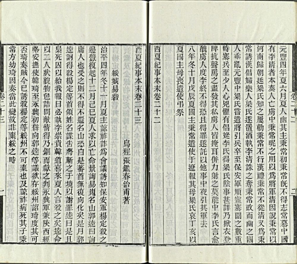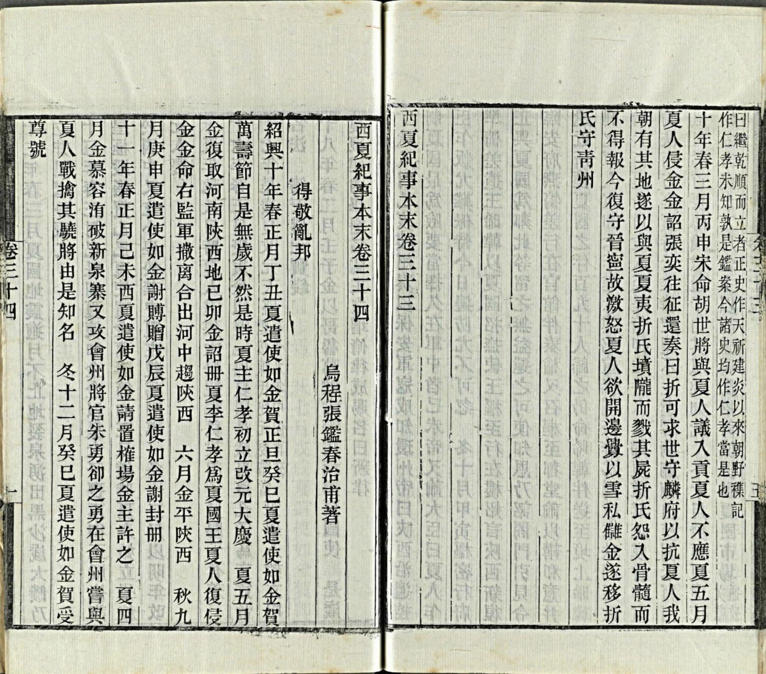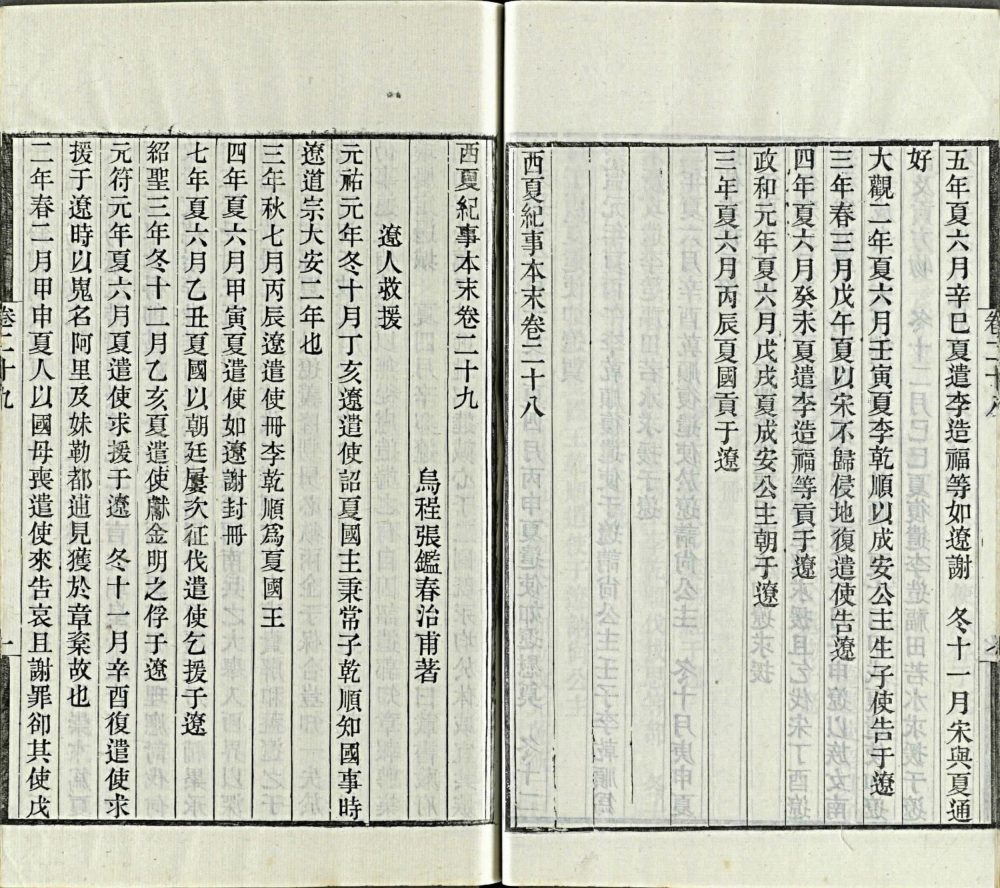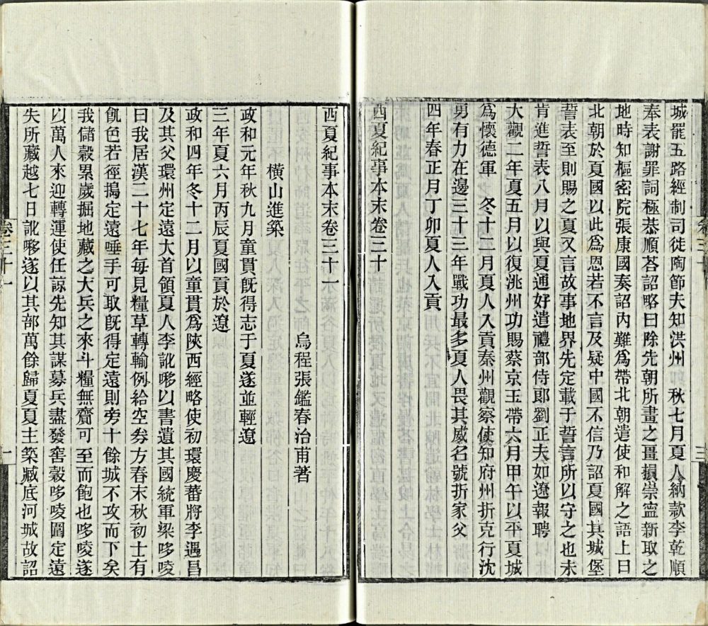 此《西夏纪事本末》由清代张鉴所著。作者从宋代各种史籍、类书、笔记、文集中辑出西夏相关史料编著成。全书含卷首二卷,正文三十六卷,记载了西夏立国前后三百多年的历史:得姓始末、夏台复入、元昊僭逆、乌白失期、灵州失陷、梁氏擅政、夹攻覆亡等事。此为清光绪十一年金陵刊本。
