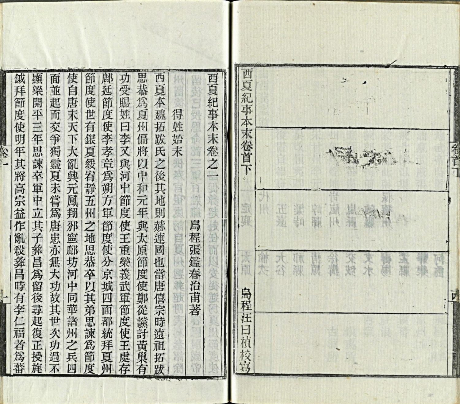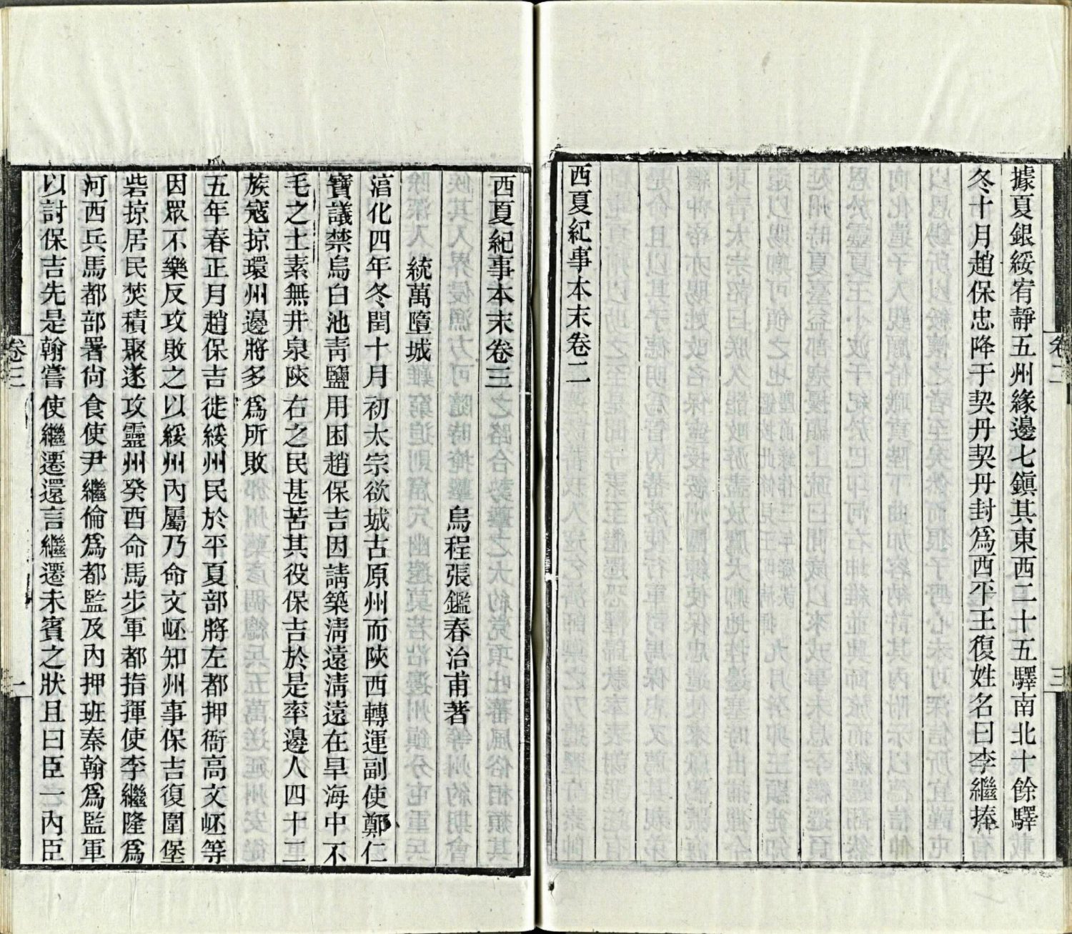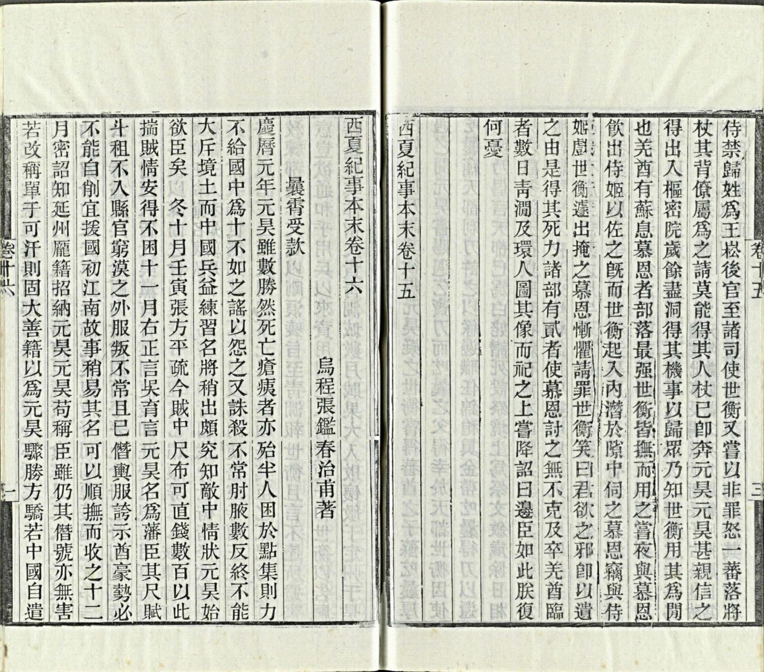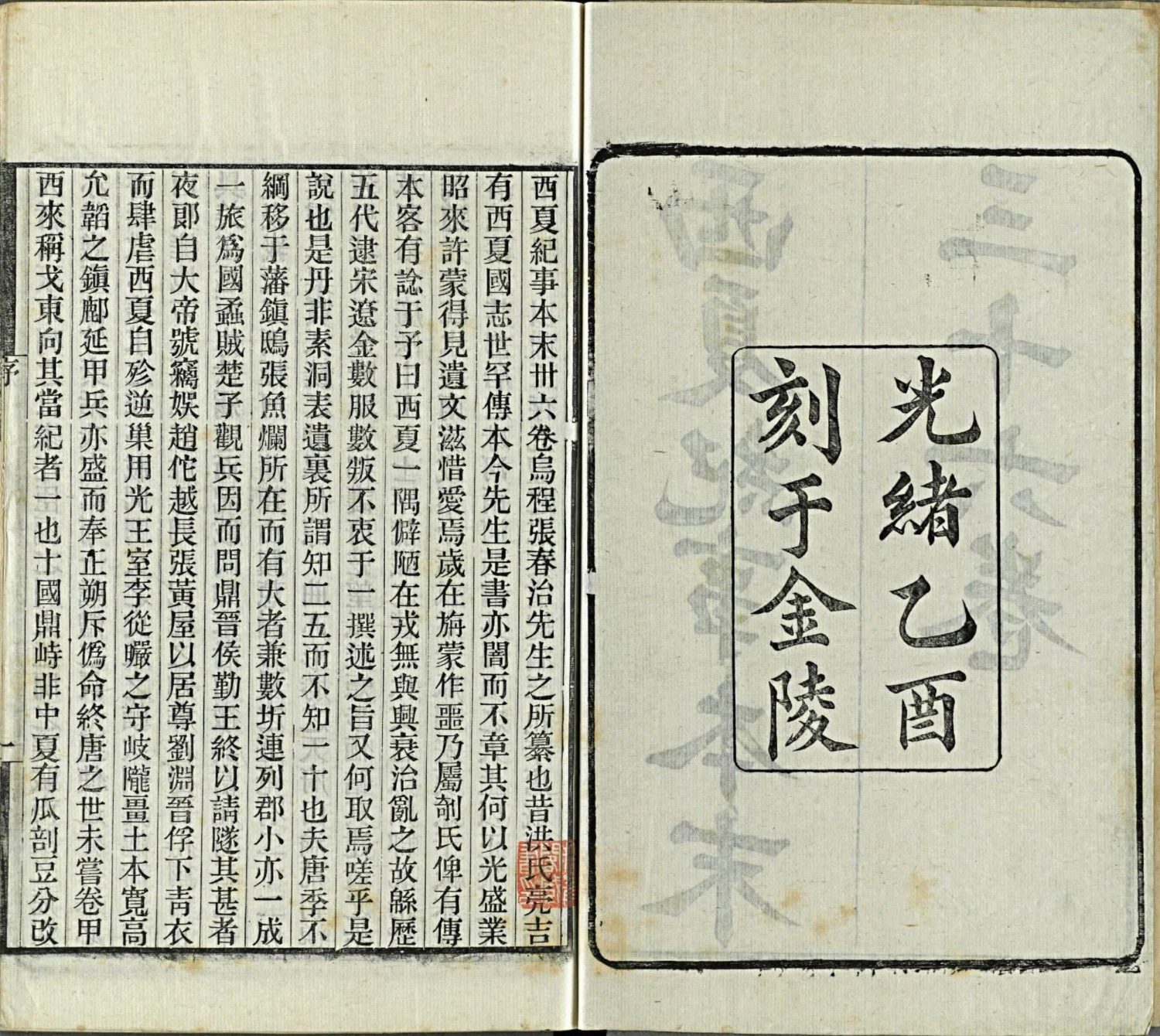 此《西夏纪事本末》由清代张鉴所著。作者从宋代各种史籍、类书、笔记、文集中辑出西夏相关史料编著成。全书含卷首二卷,正文三十六卷,记载了西夏立国前后三百多年的历史:得姓始末、夏台复入、元昊僭逆、乌白失期、灵州失陷、梁氏擅政、夹攻覆亡等事。此为清光绪十一年金陵刊本。