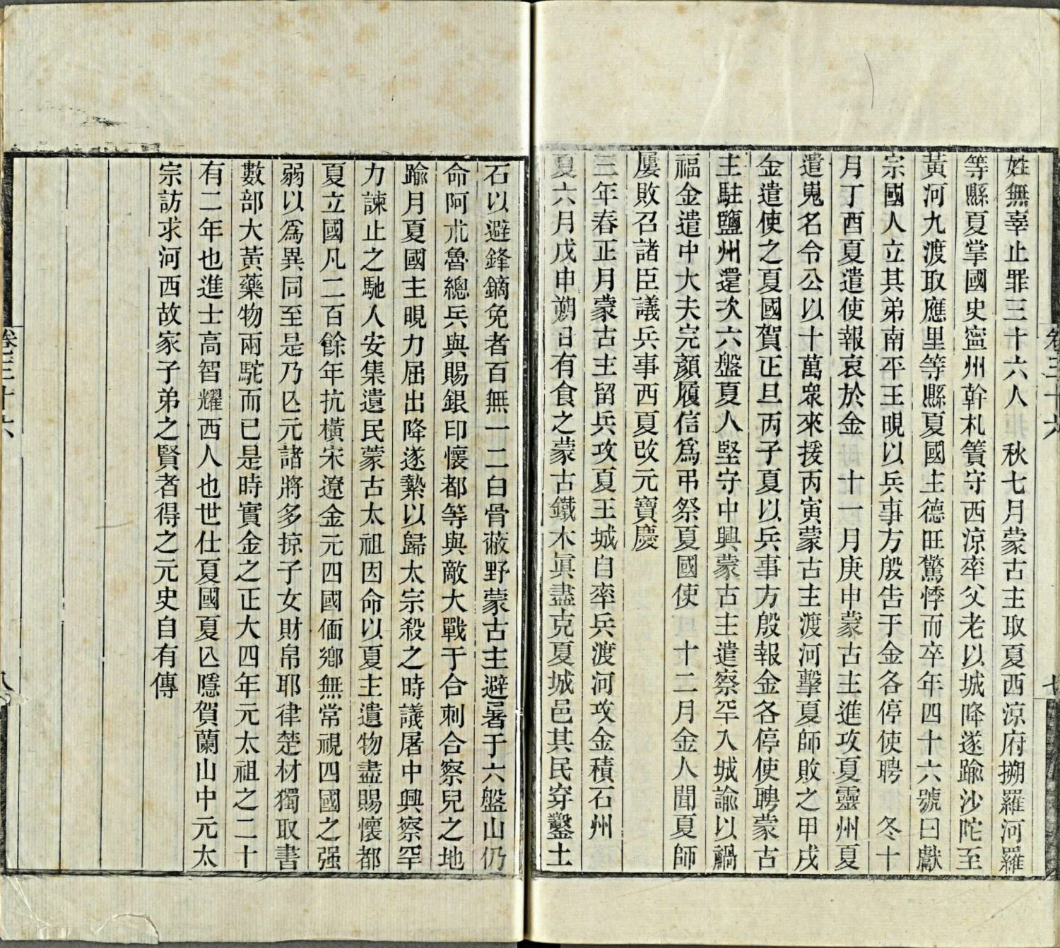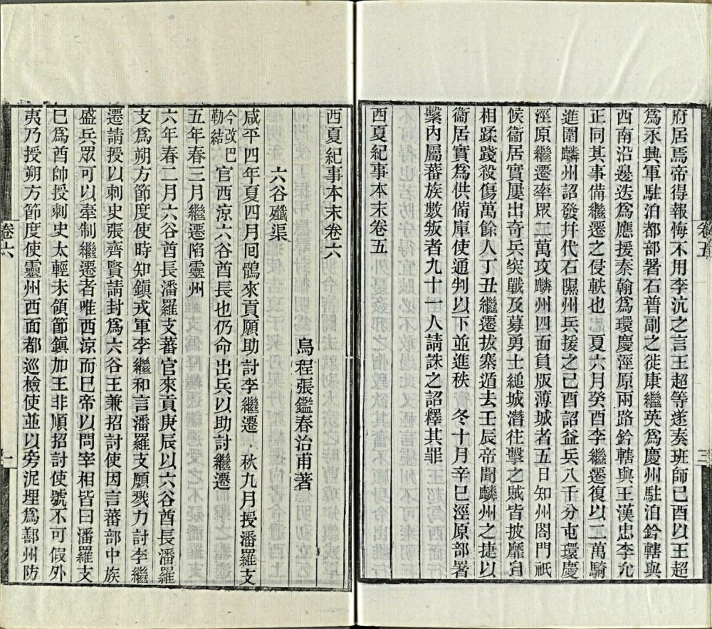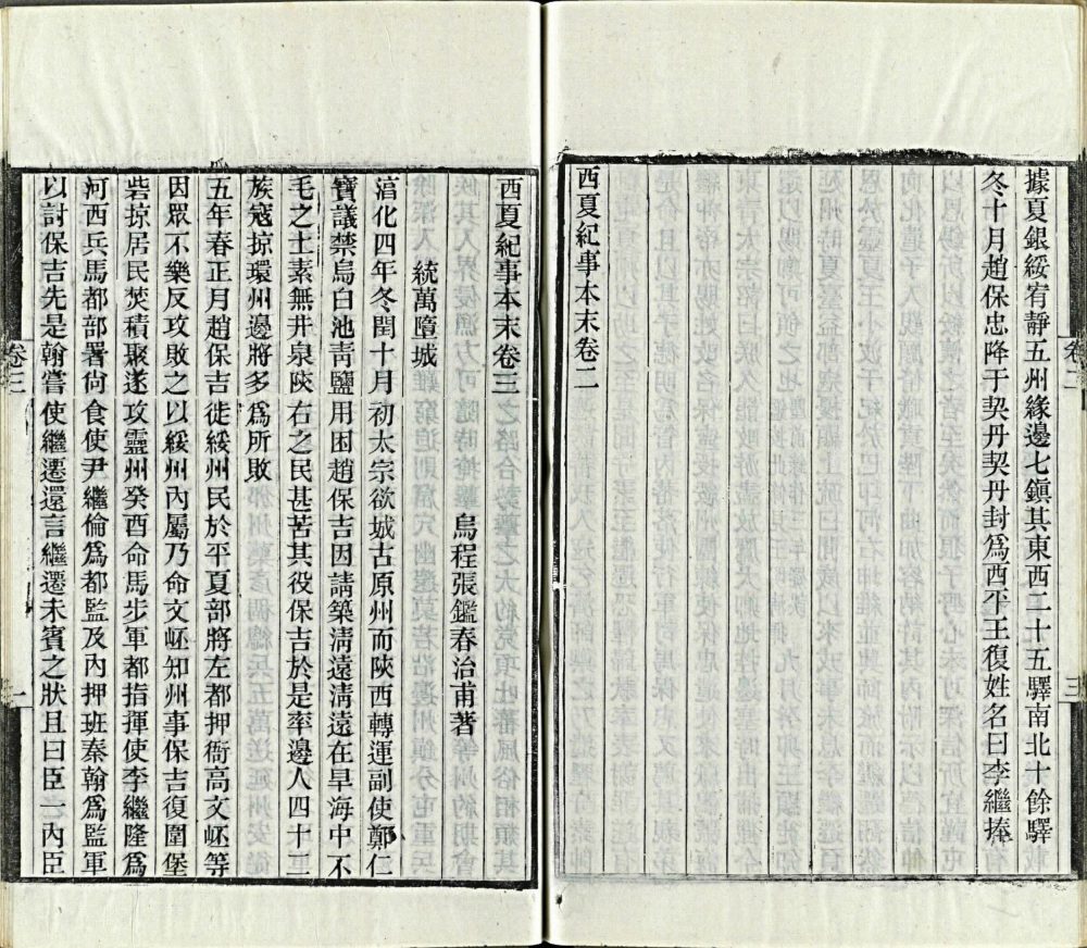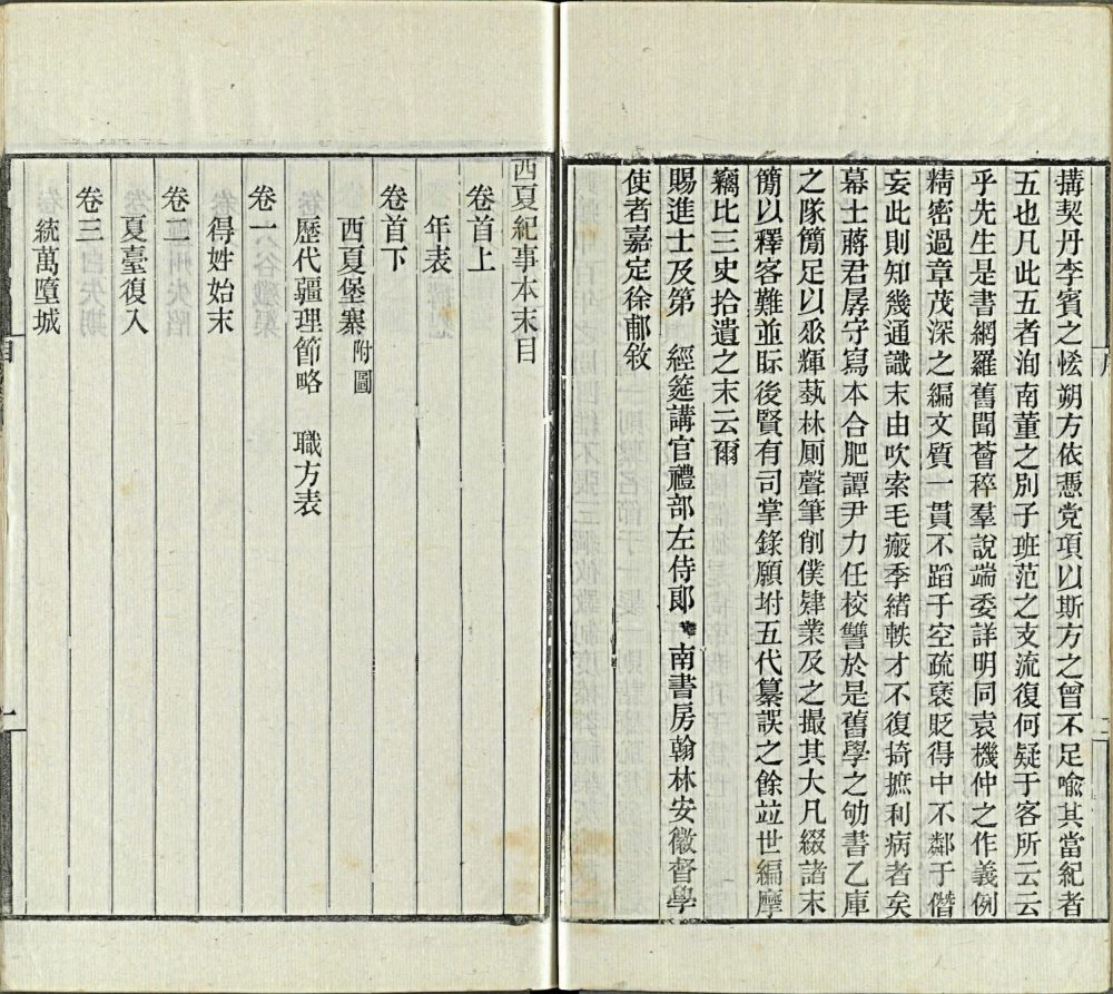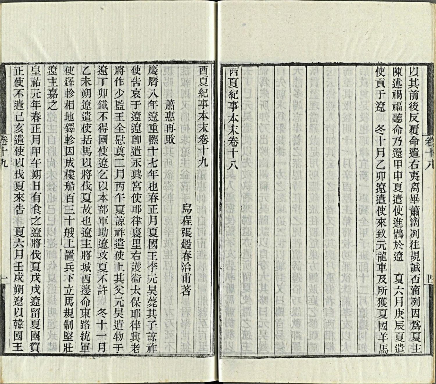 此《西夏纪事本末》由清代张鉴所著。作者从宋代各种史籍、类书、笔记、文集中辑出西夏相关史料编著成。全书含卷首二卷,正文三十六卷,记载了西夏立国前后三百多年的历史:得姓始末、夏台复入、元昊僭逆、乌白失期、灵州失陷、梁氏擅政、夹攻覆亡等事。此为清光绪十一年金陵刊本。