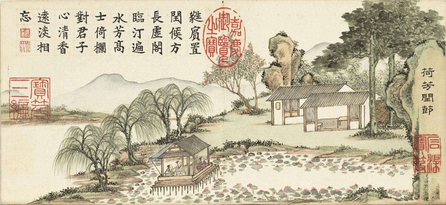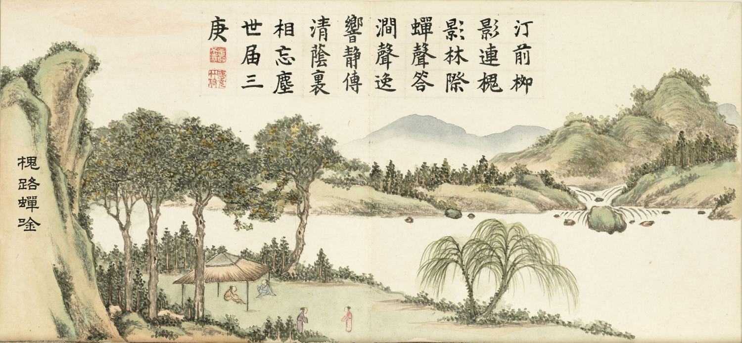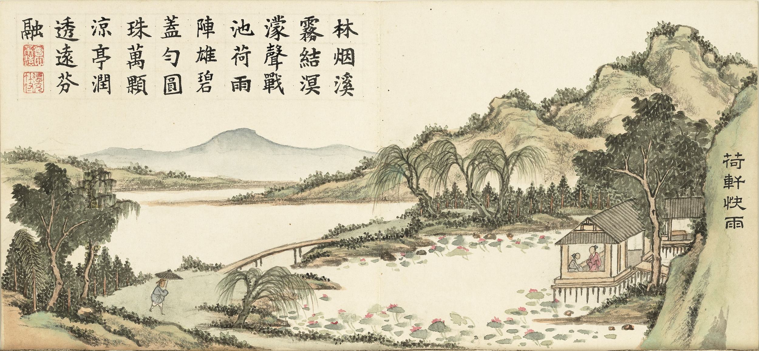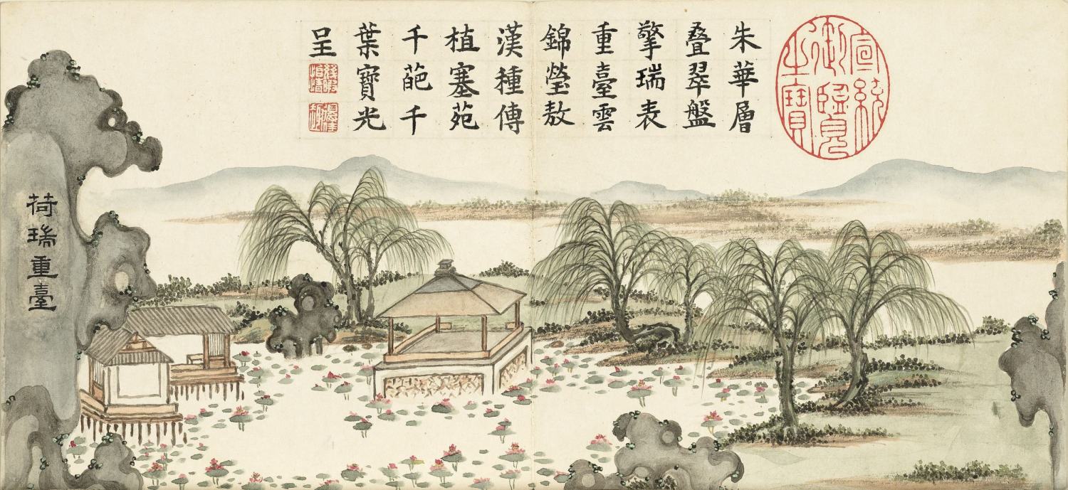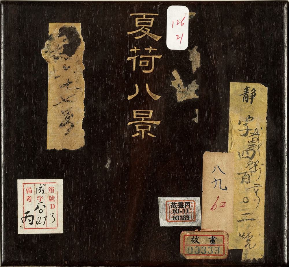 此《夏荷八景》《夏槐八景》册由清代戴衢亨绘。全套共两册各八开,依次为:荷芳闰节、荷瑞重台、荷轩快雨、荷阁薰风、荷杯泛绿、荷舫摇红、荷池鱼戏、荷沼禽嬉;槐市横经、槐黄试举、槐街珂集、槐路蝉吟、槐舞虬龙、槐阴霁月、槐厅瀹茗、槐谷飞甘。每幅配有清嘉庆帝题诗。此套现藏于台北故宫博物院。