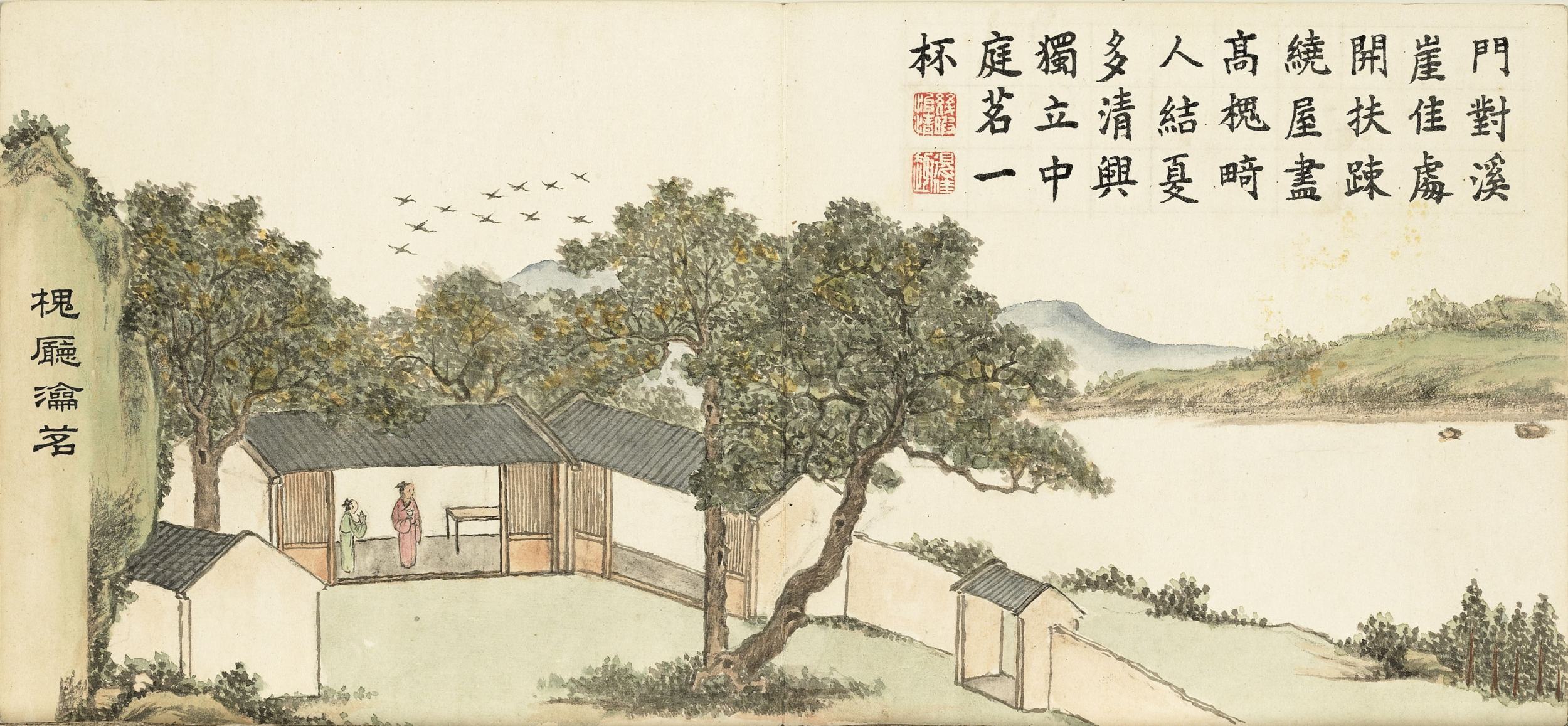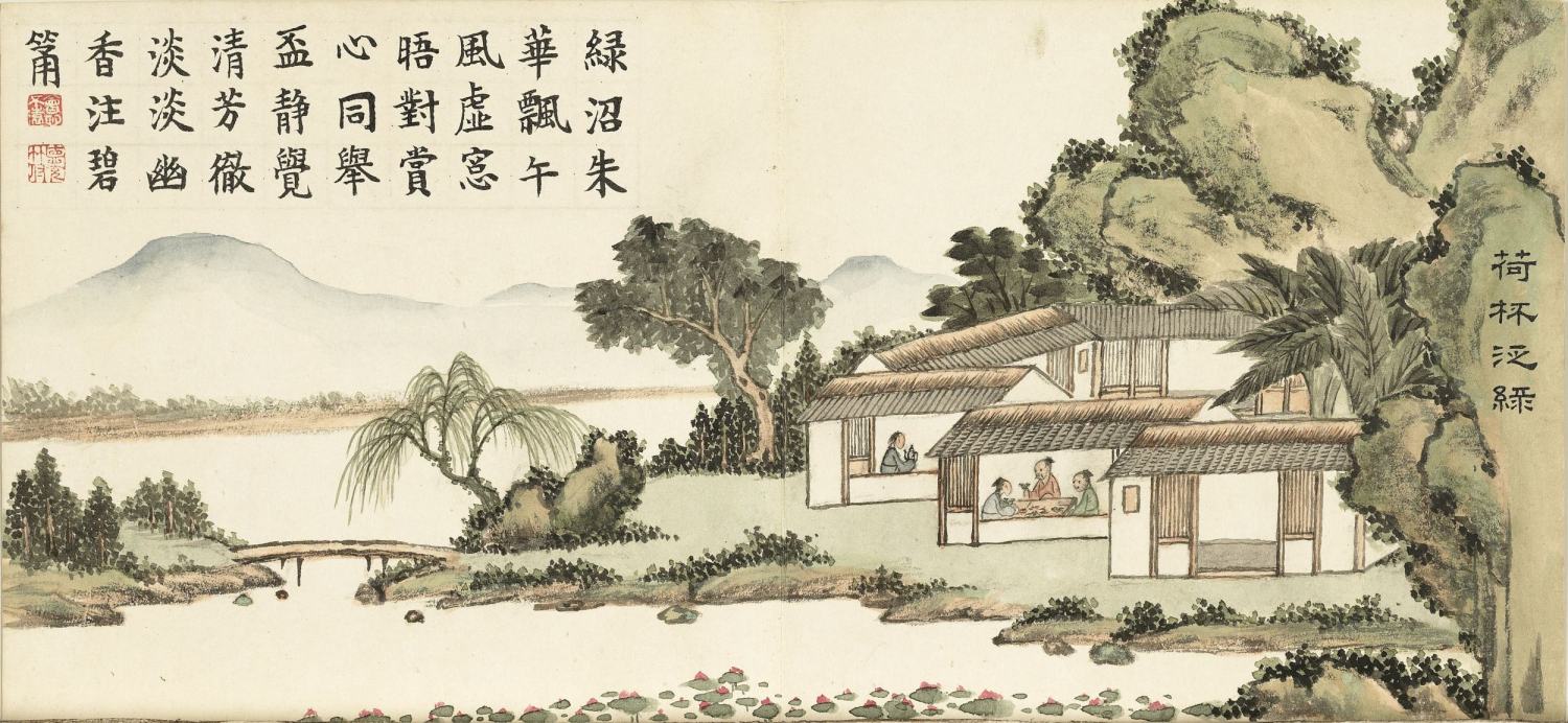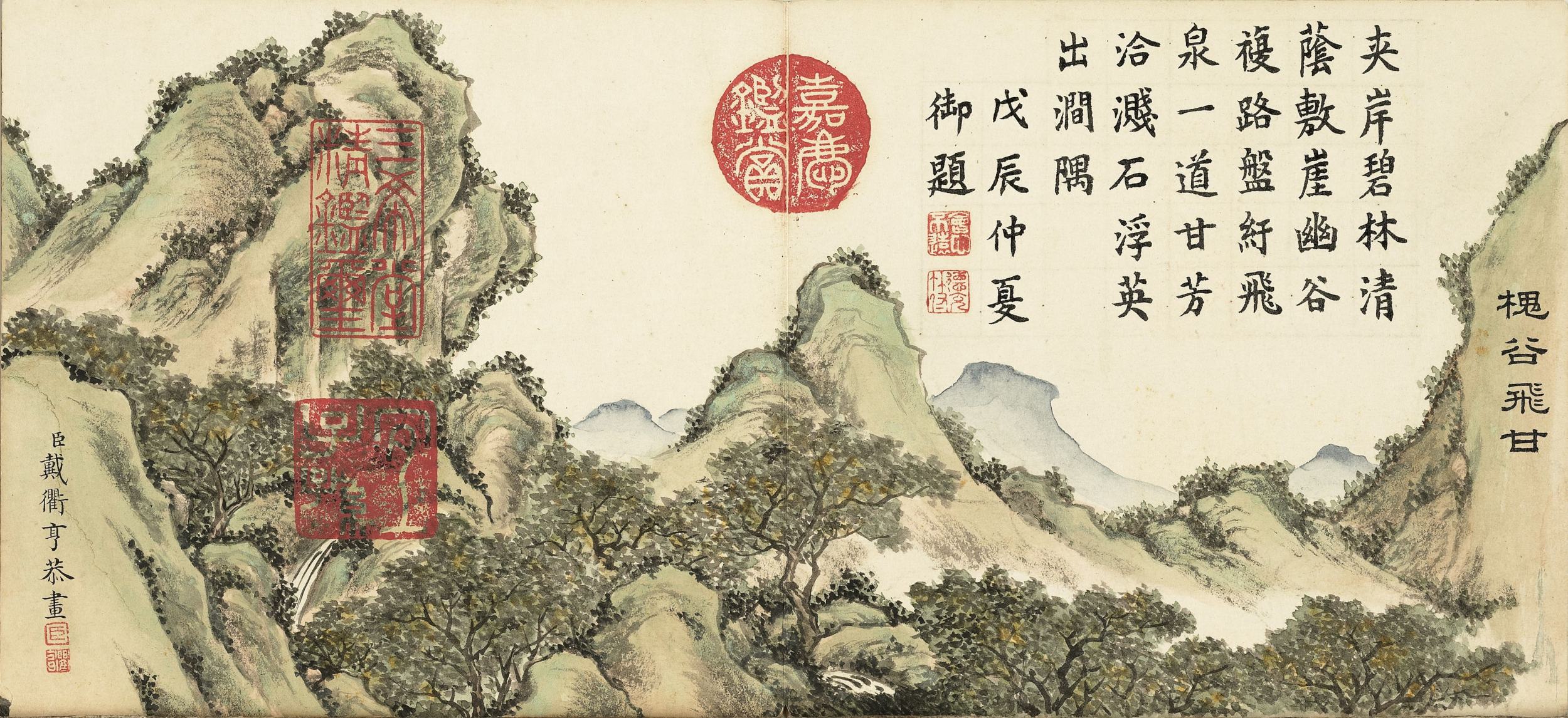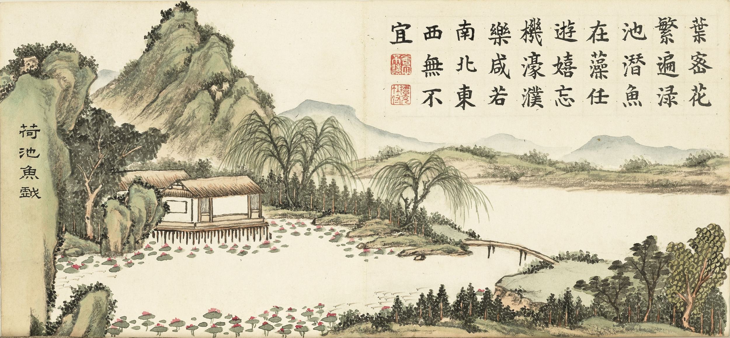 此《夏荷八景》《夏槐八景》册由清代戴衢亨绘。全套共两册各八开,依次为:荷芳闰节、荷瑞重台、荷轩快雨、荷阁薰风、荷杯泛绿、荷舫摇红、荷池鱼戏、荷沼禽嬉;槐市横经、槐黄试举、槐街珂集、槐路蝉吟、槐舞虬龙、槐阴霁月、槐厅瀹茗、槐谷飞甘。每幅配有清嘉庆帝题诗。此套现藏于台北故宫博物院。