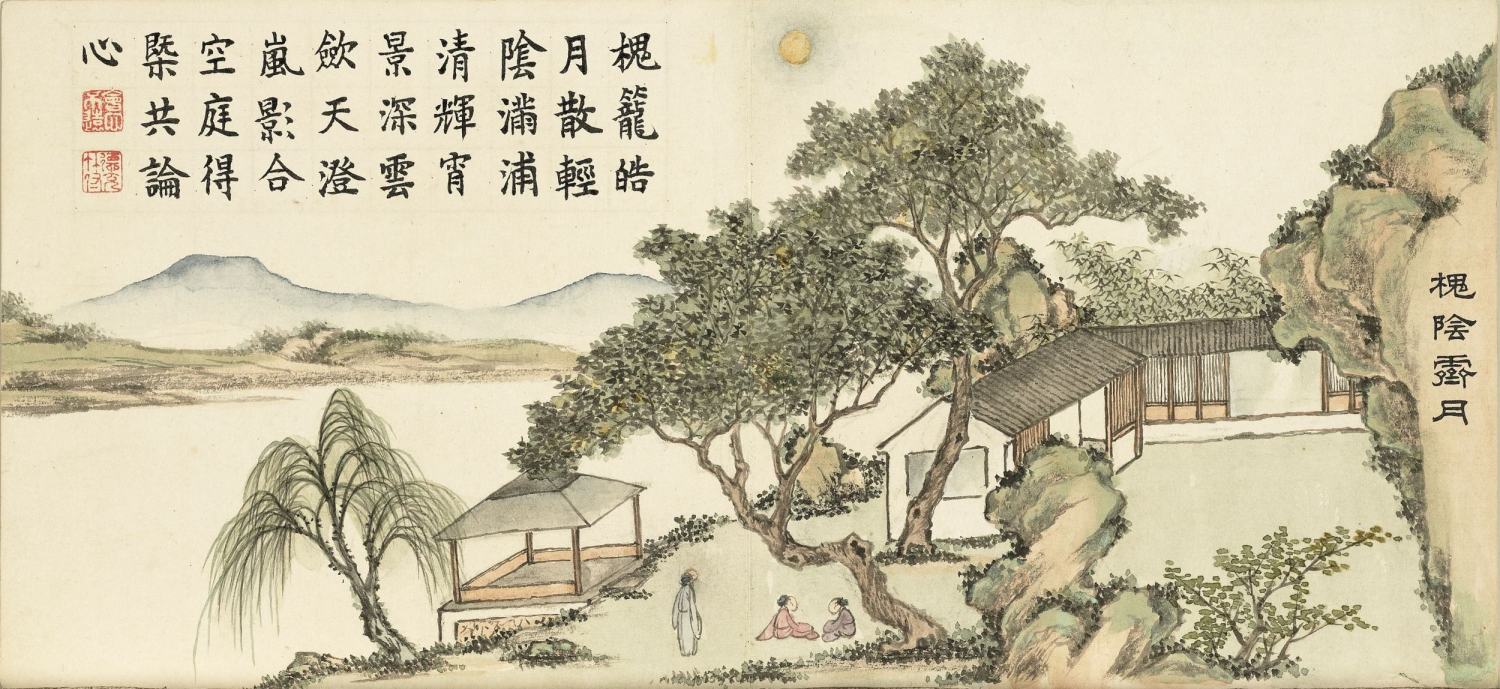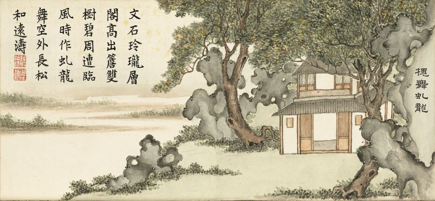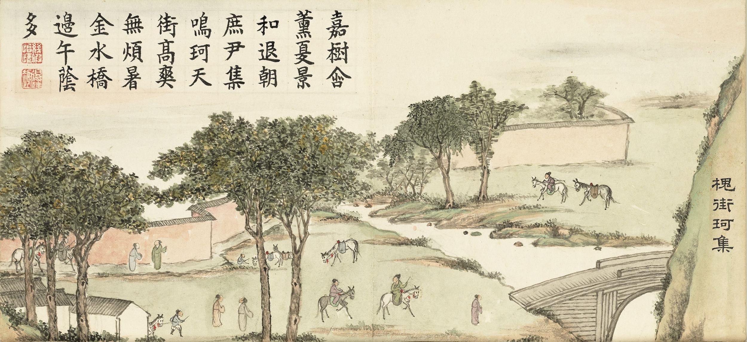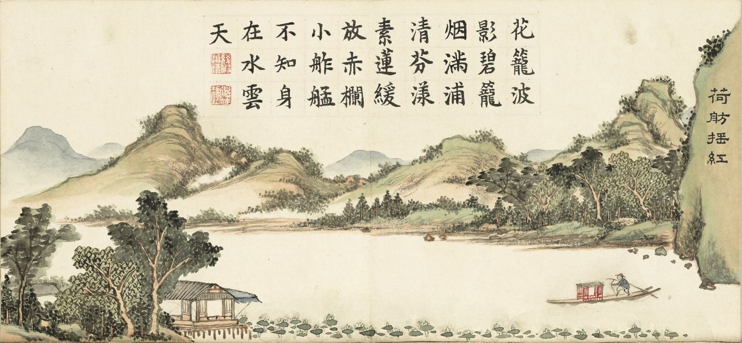 此《夏荷八景》《夏槐八景》册由清代戴衢亨绘。全套共两册各八开,依次为:荷芳闰节、荷瑞重台、荷轩快雨、荷阁薰风、荷杯泛绿、荷舫摇红、荷池鱼戏、荷沼禽嬉;槐市横经、槐黄试举、槐街珂集、槐路蝉吟、槐舞虬龙、槐阴霁月、槐厅瀹茗、槐谷飞甘。每幅配有清嘉庆帝题诗。此套现藏于台北故宫博物院。