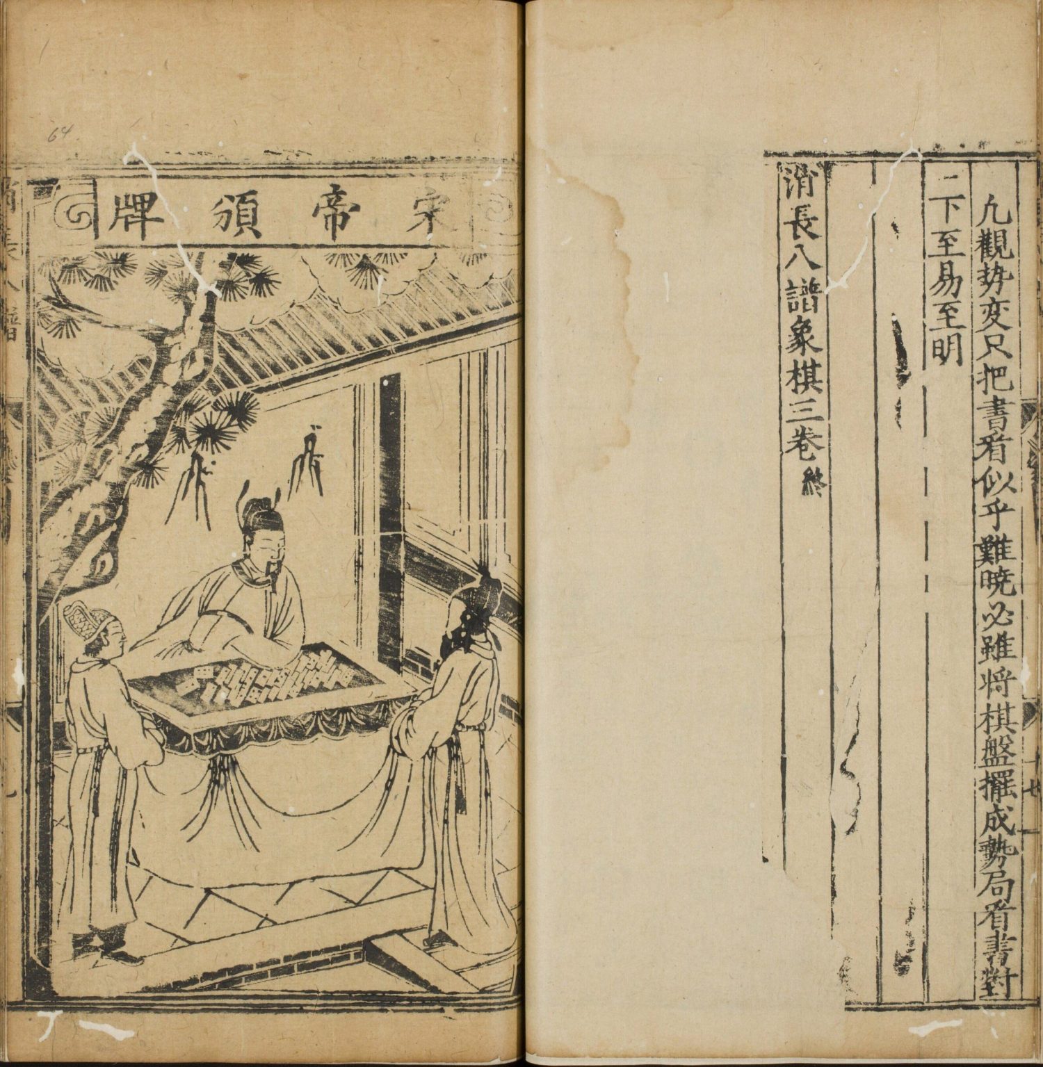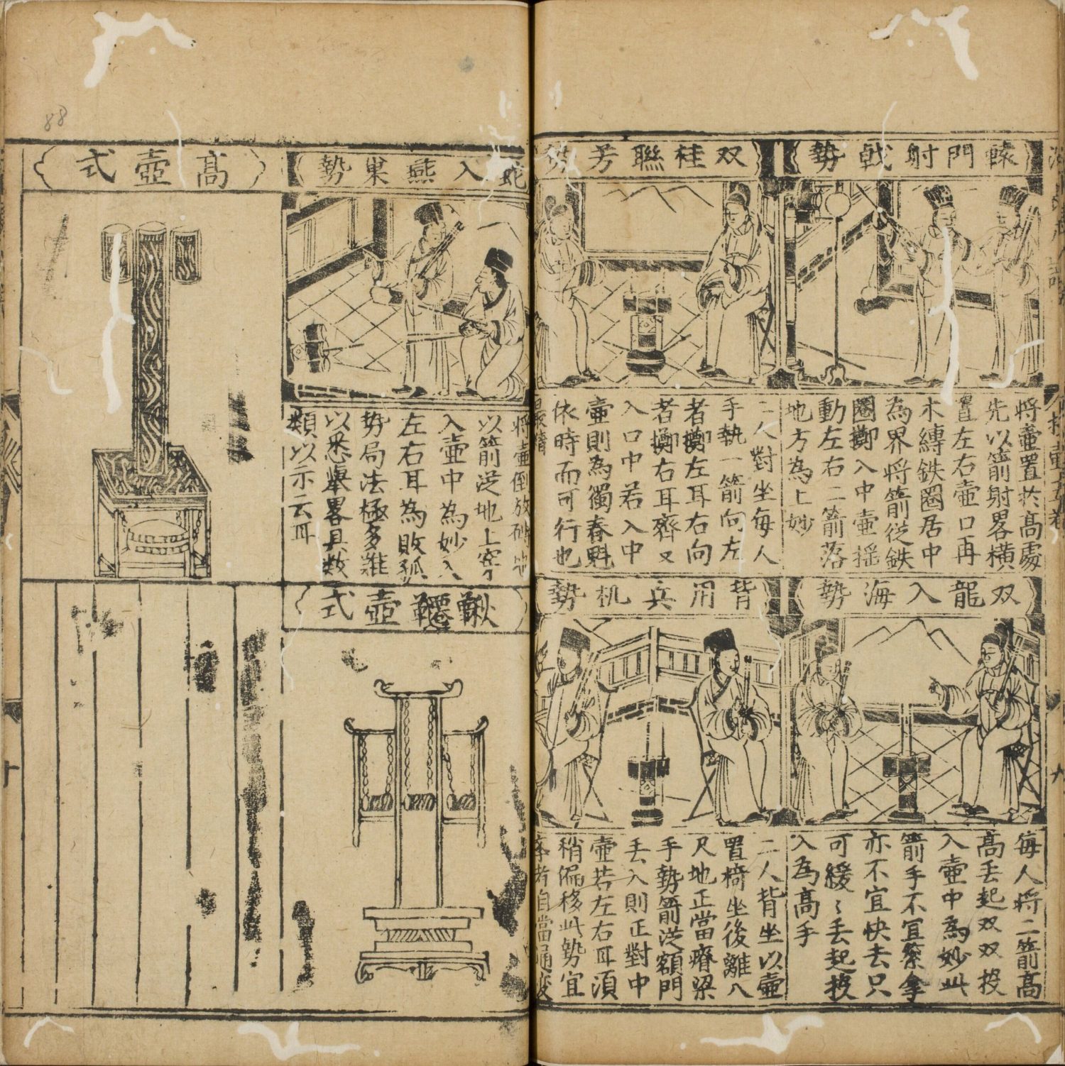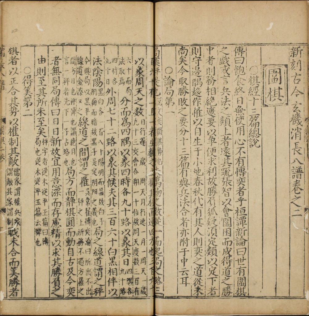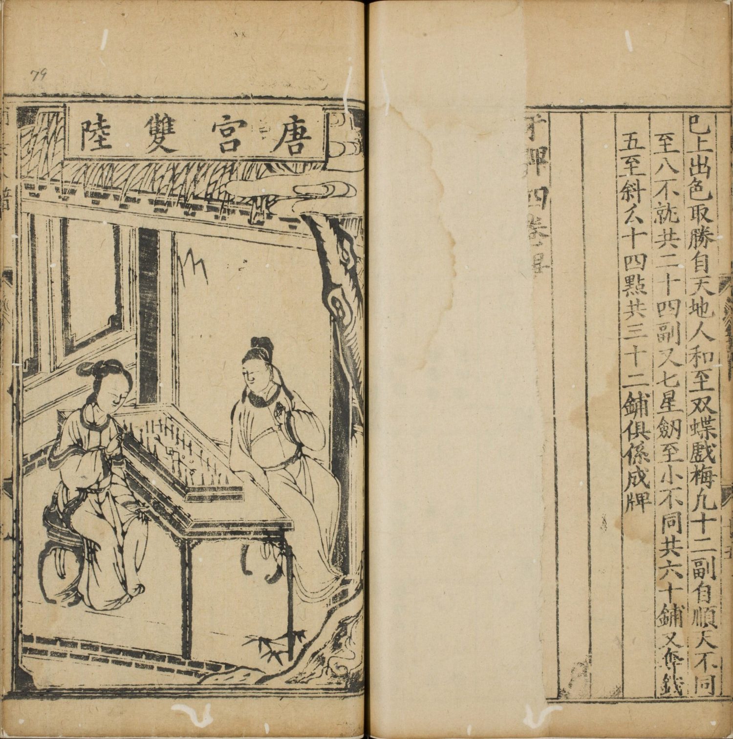 此《新刻古今玄机消长八谱》未著编者名,其内容为休闲娱乐日用类书。全书共六卷,包含:琴谱、围棋、象棋式、牙牌、双陆、投壶、戏毬、骰色硃窝八谱,每卷首冠全幅版画,内附相关谱类玩法插图。此为明代潭邑刘龙田刊本。