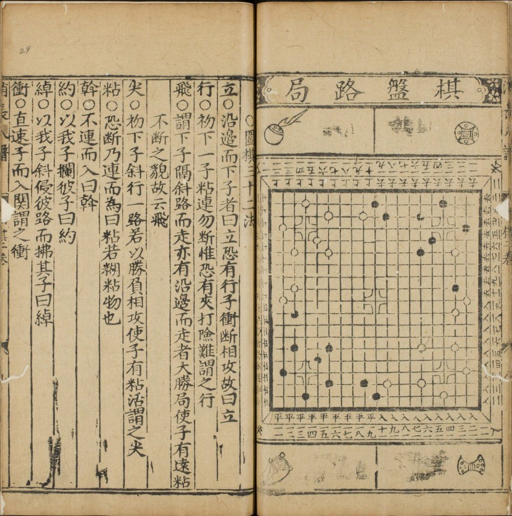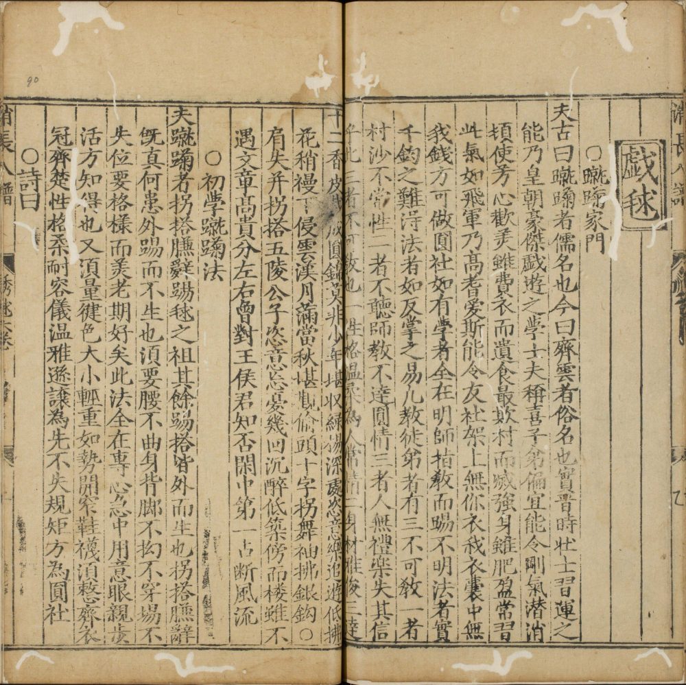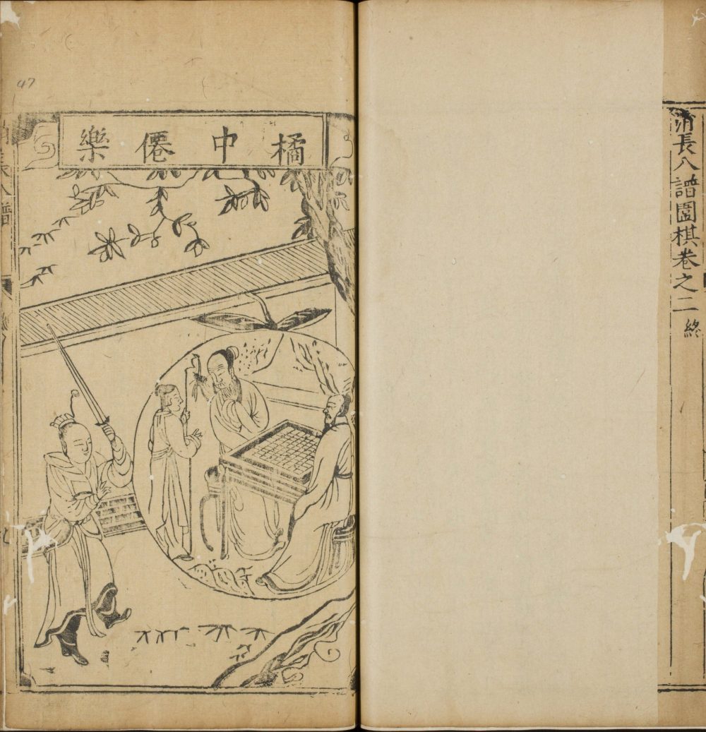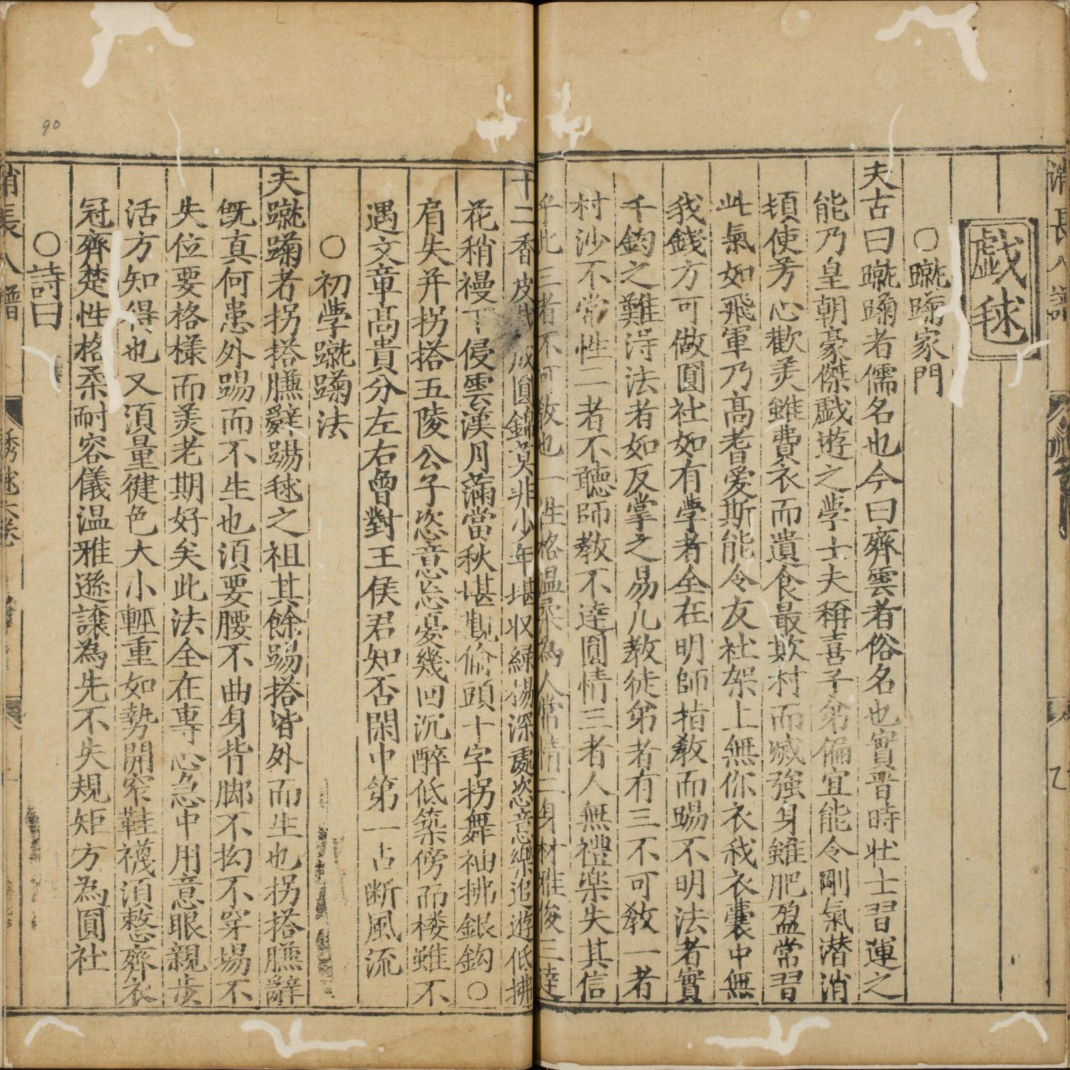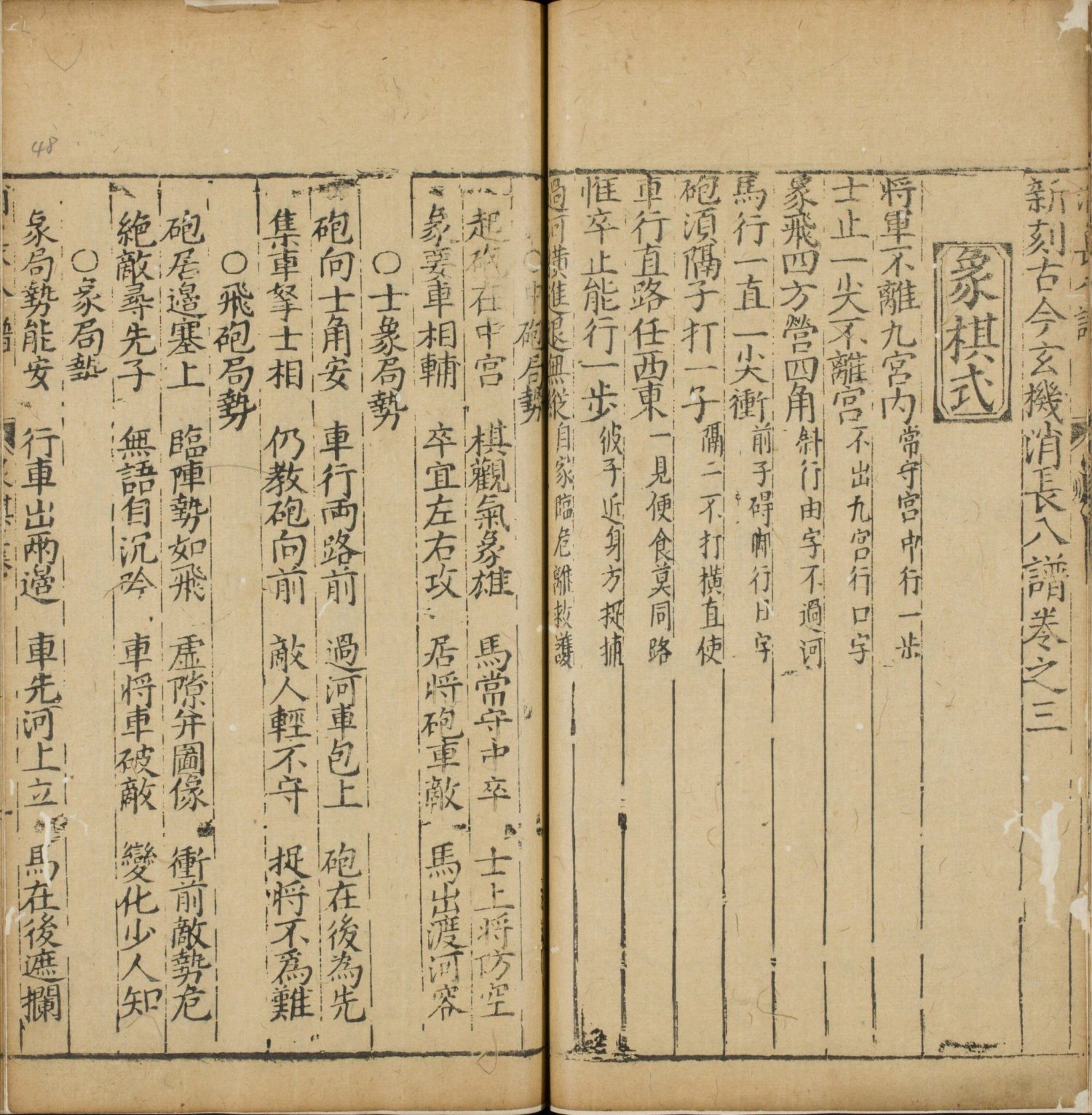 此《新刻古今玄机消长八谱》未著编者名,其内容为休闲娱乐日用类书。全书共六卷,包含:琴谱、围棋、象棋式、牙牌、双陆、投壶、戏毬、骰色硃窝八谱,每卷首冠全幅版画,内附相关谱类玩法插图。此为明代潭邑刘龙田刊本。