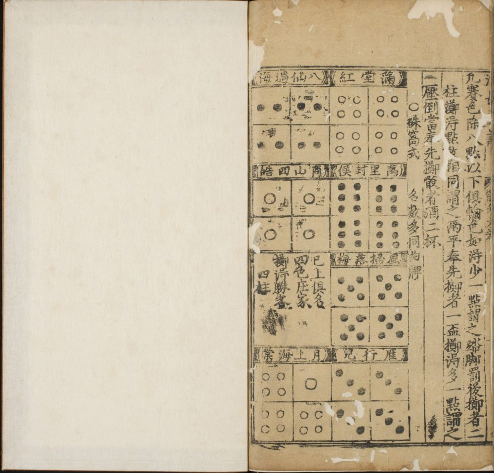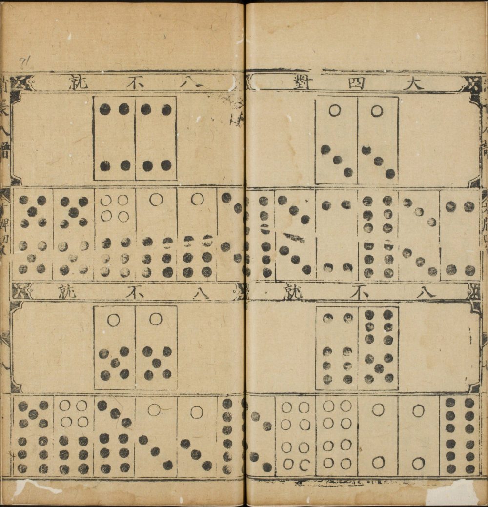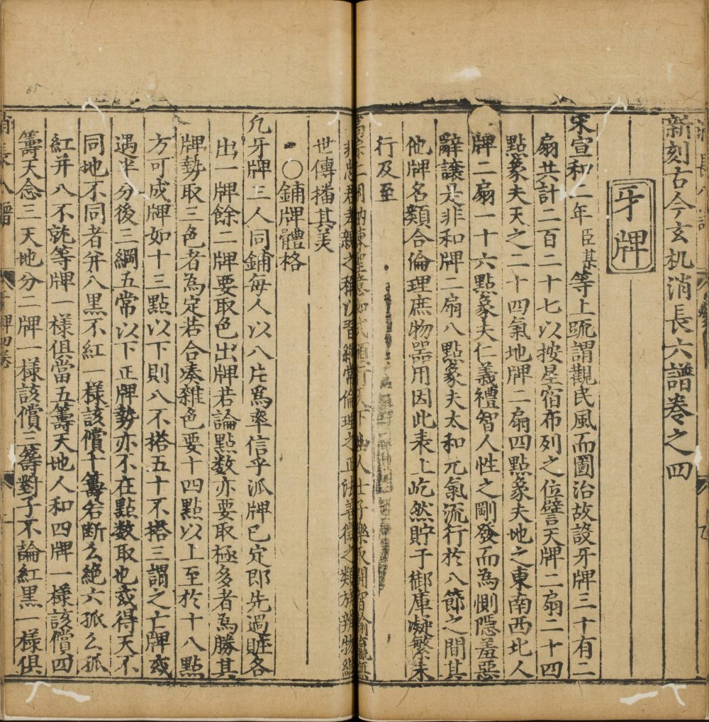 卷四:牙牌 [1] 牙牌即骨牌,传说起源于北宋宣和年间。因使用材质为象牙,故名。各种成套点色都有名称,类似牌九。 (首图题:宋帝頒牌)
