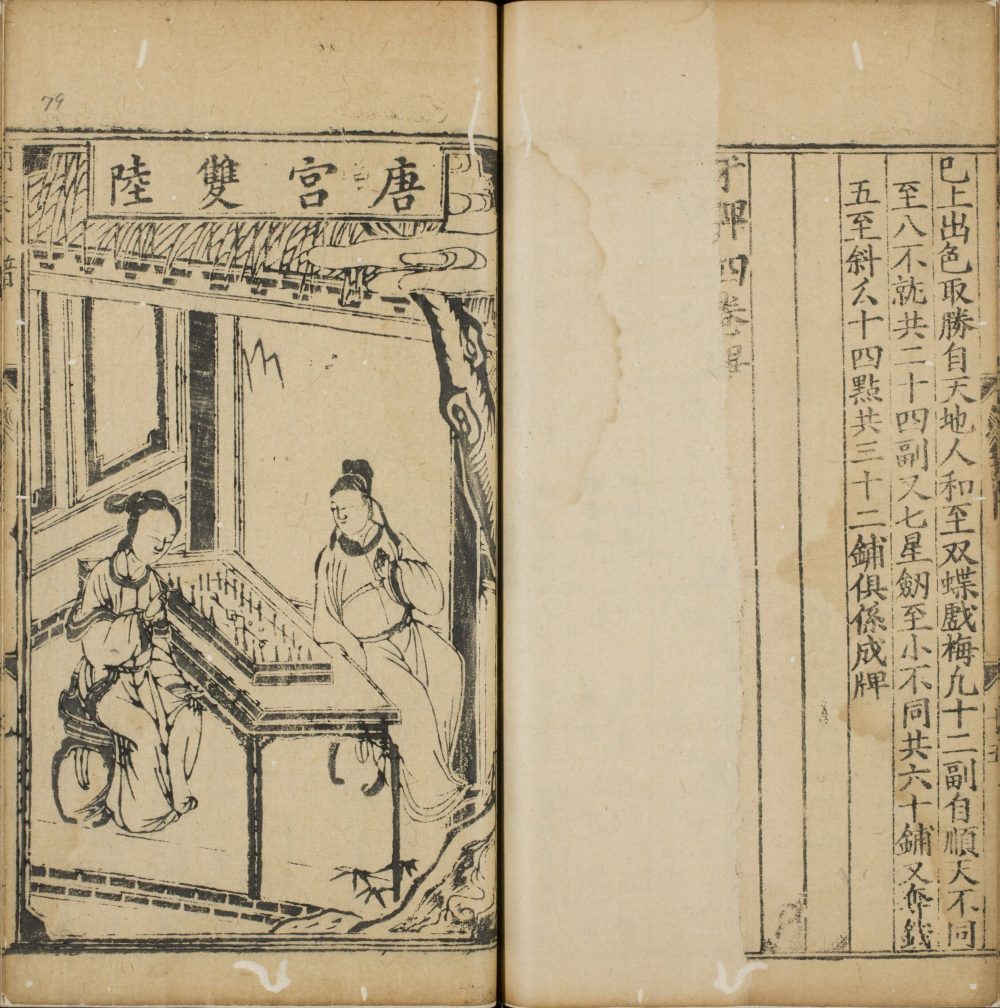 双陆:古代长期流传的掷赛游戏,两粒骰子,双方各 15 枚棋子。