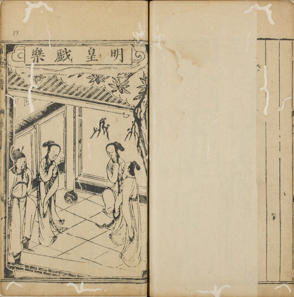 卷六:戏毬、骰色硃窝 [3] 硃窝:骰子的名称。因其凹点内常涂以红色,故称。 (首图题:明皇戲樂)