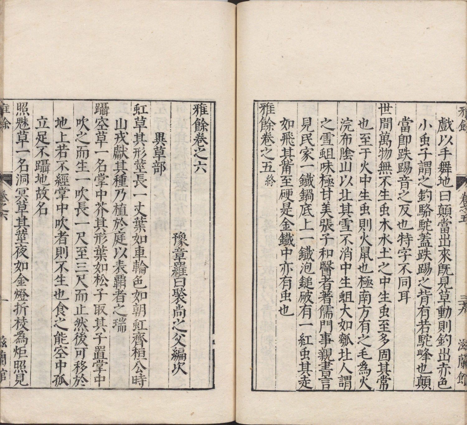此《雅余》是明代罗曰褧编篡的一部诠释《尔雅》的类书。全书共八卷,分为:天文、月令、地理、人、仙释、博物、异域、报应、祥瑞、瑞鸟、龙、江湖鱼、海物、水草、五谷、木、果、花、金、玉、珠、香、砚、服饰等六十二部。此为明万历二十五年滋兰馆刊本。