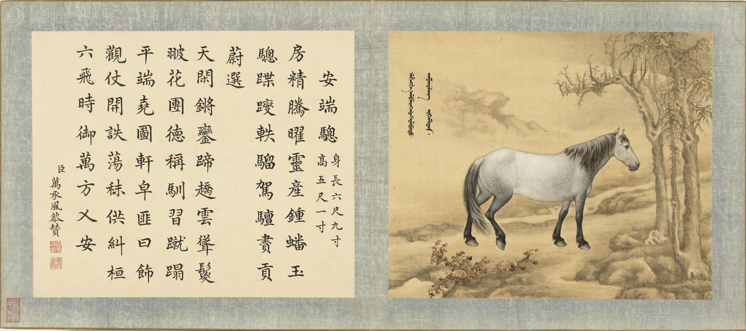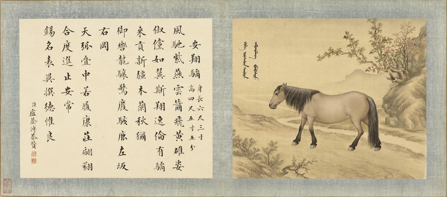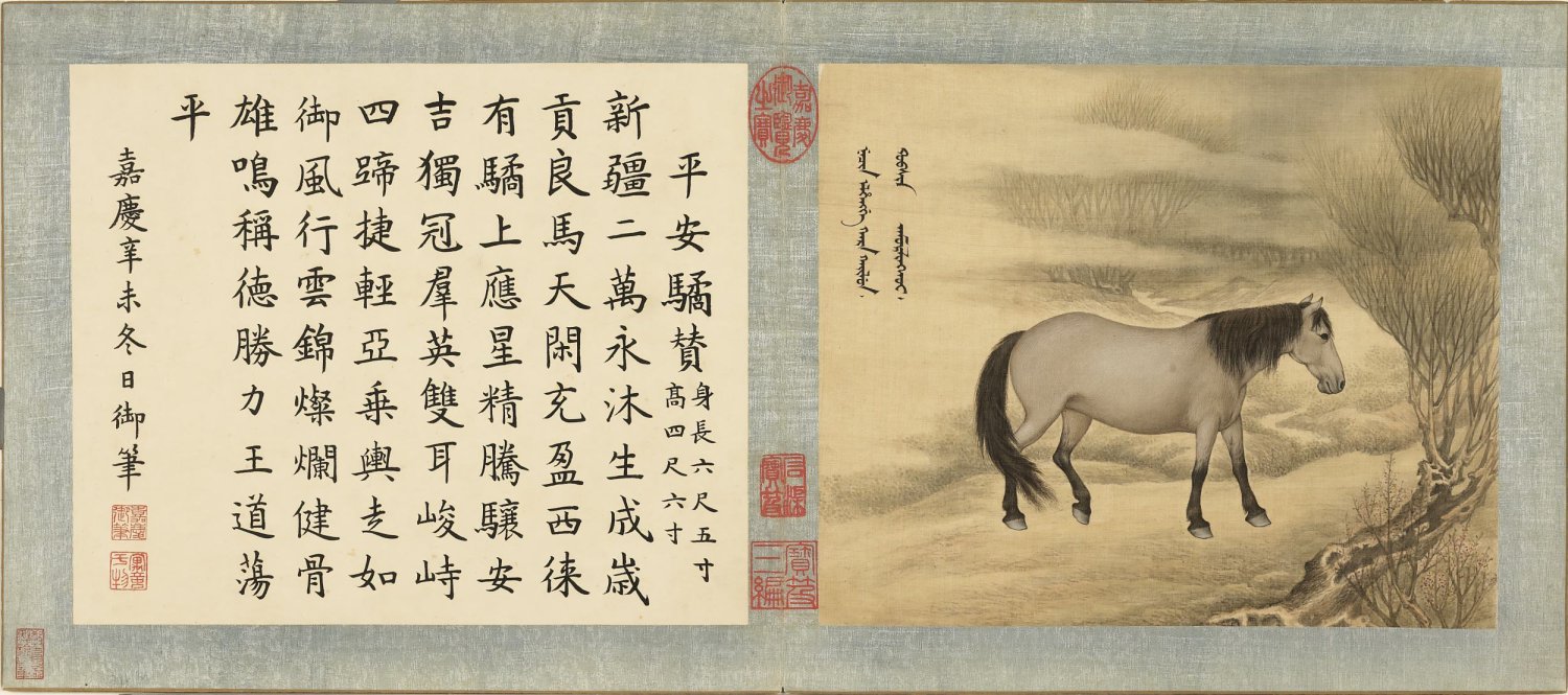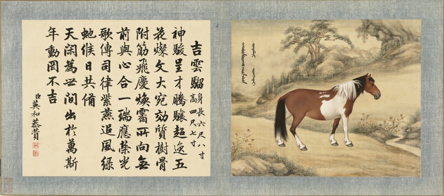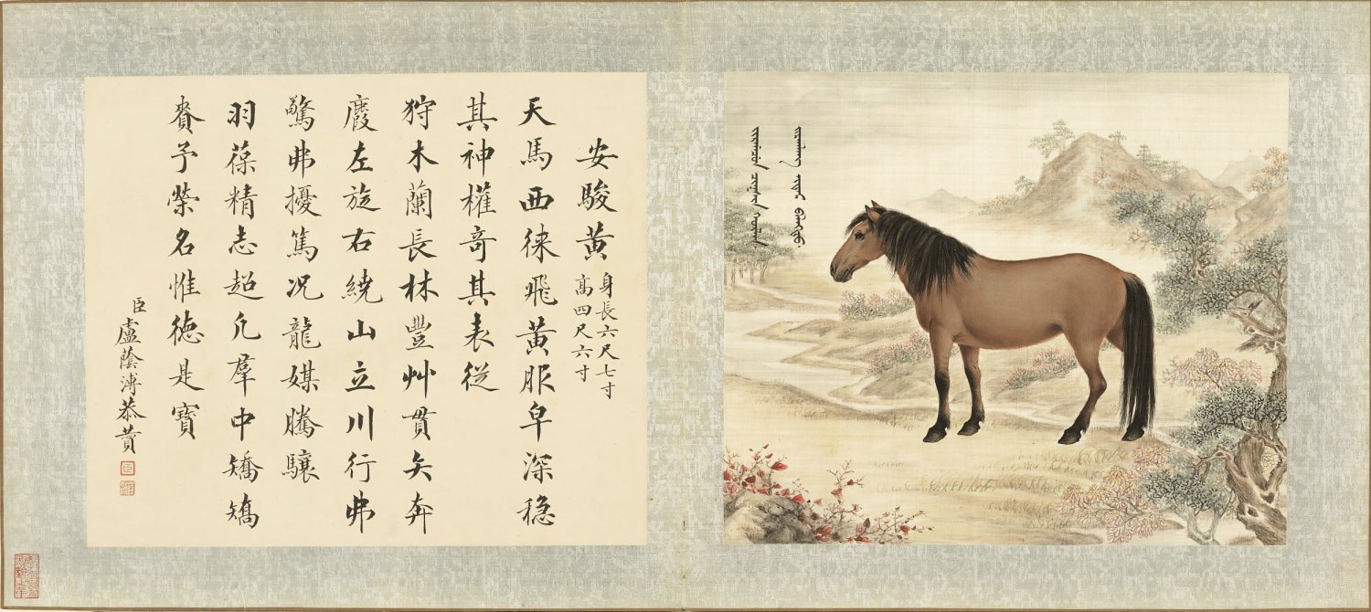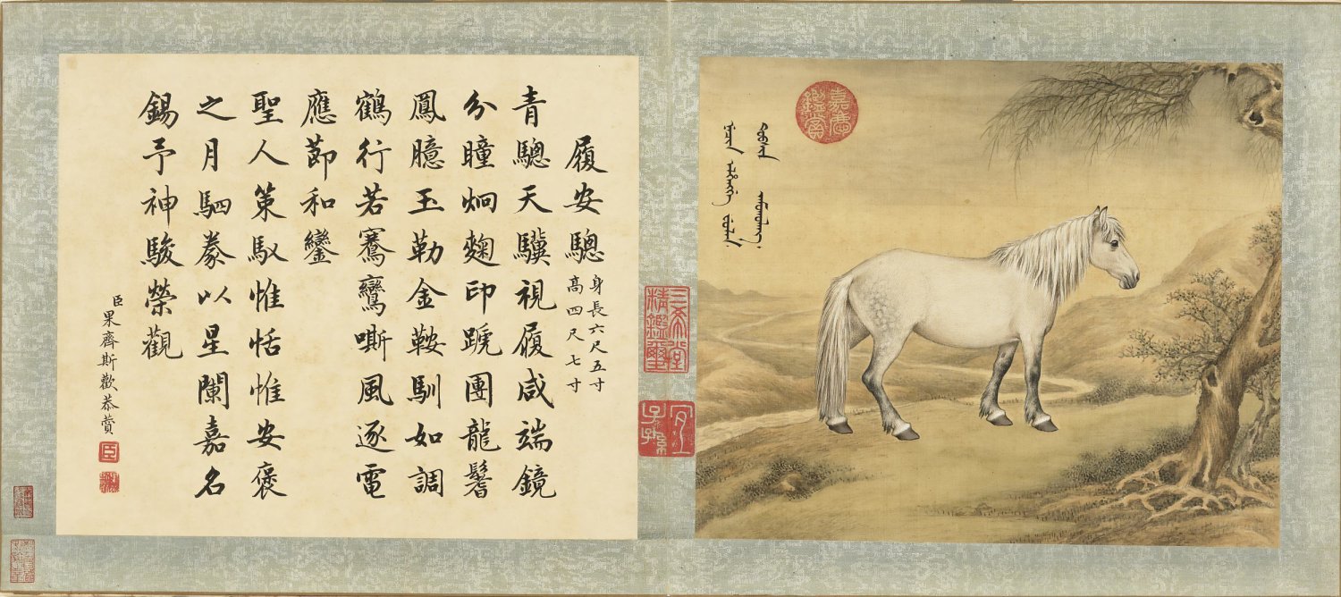此《御马图》册由清代宫廷画师绘制。全册共十二开,描绘了清内府十二匹从西域或蒙古进呈的坐骑:安端骢、安俊黄、良吉骝、吉云骝、平安驈、安顺骢、安翔驈、庆吉骝、云锦骢、安骏黄、宝花骓、履安骢。左页为清嘉庆十六年嘉庆帝和群臣赞。此册现藏于台北故宫博物院。