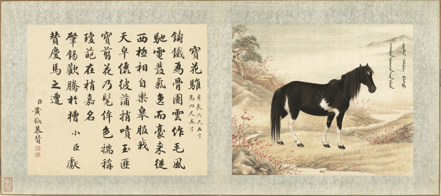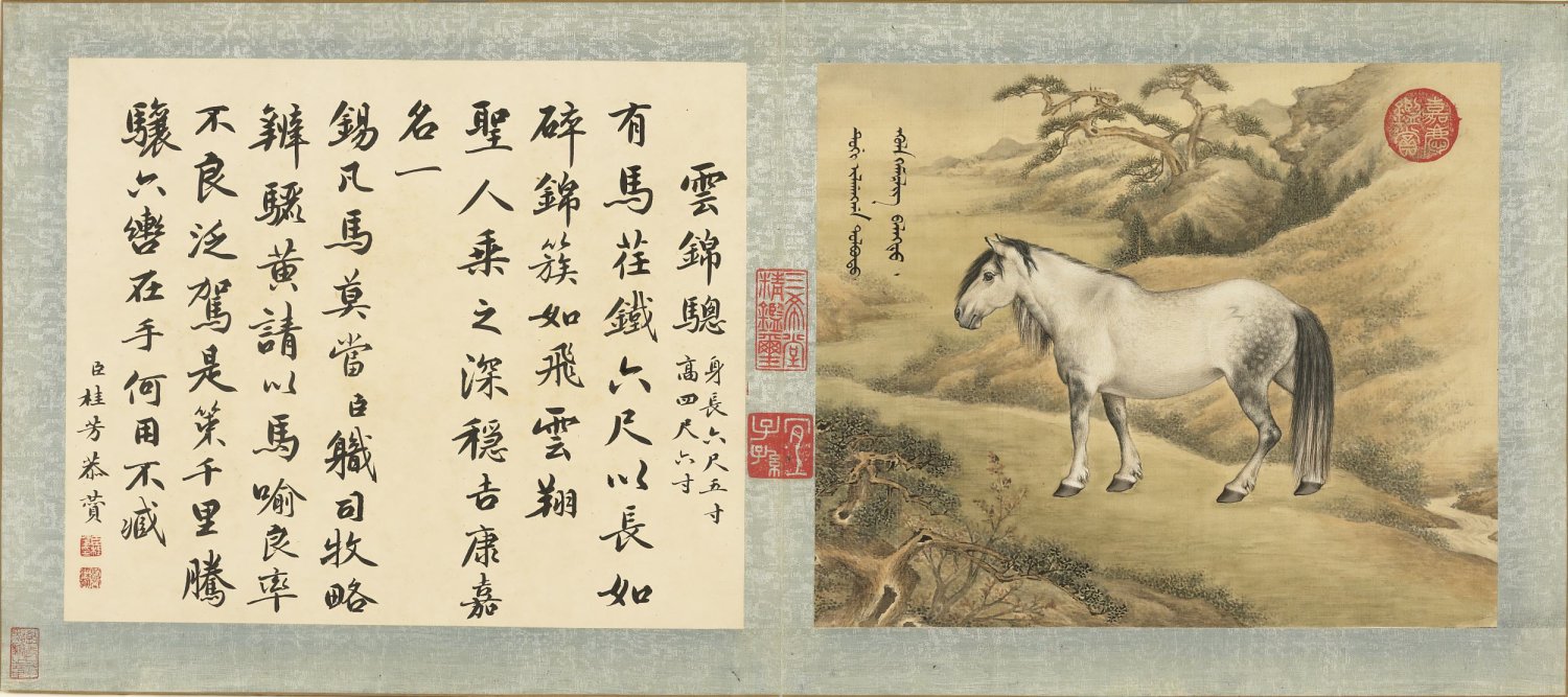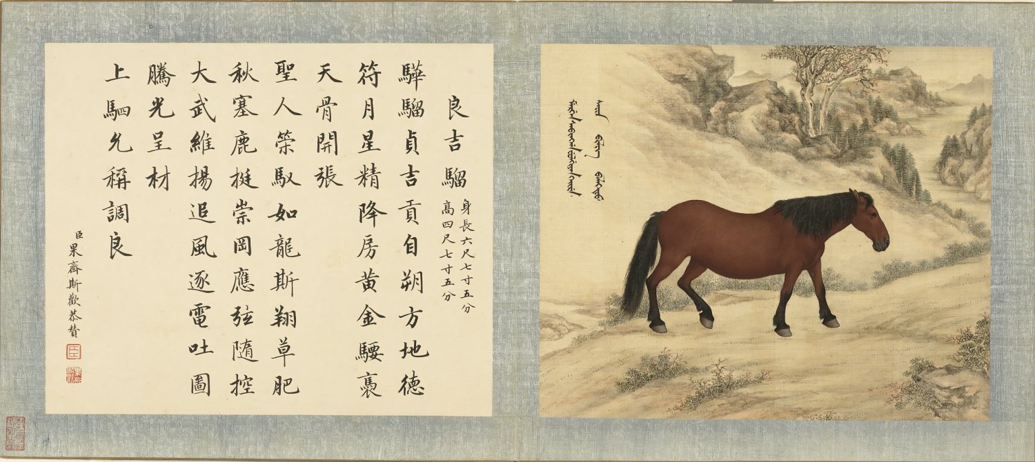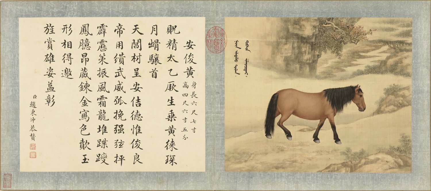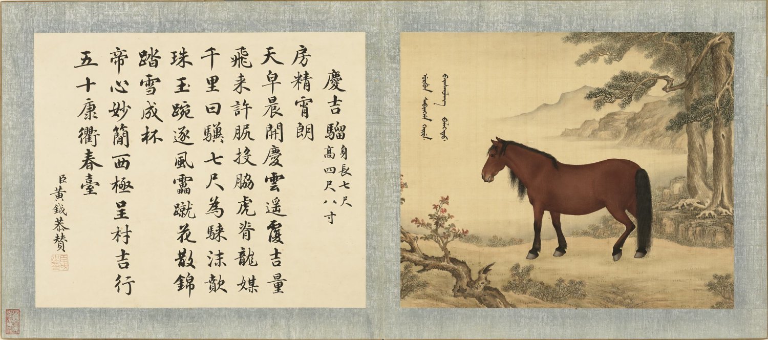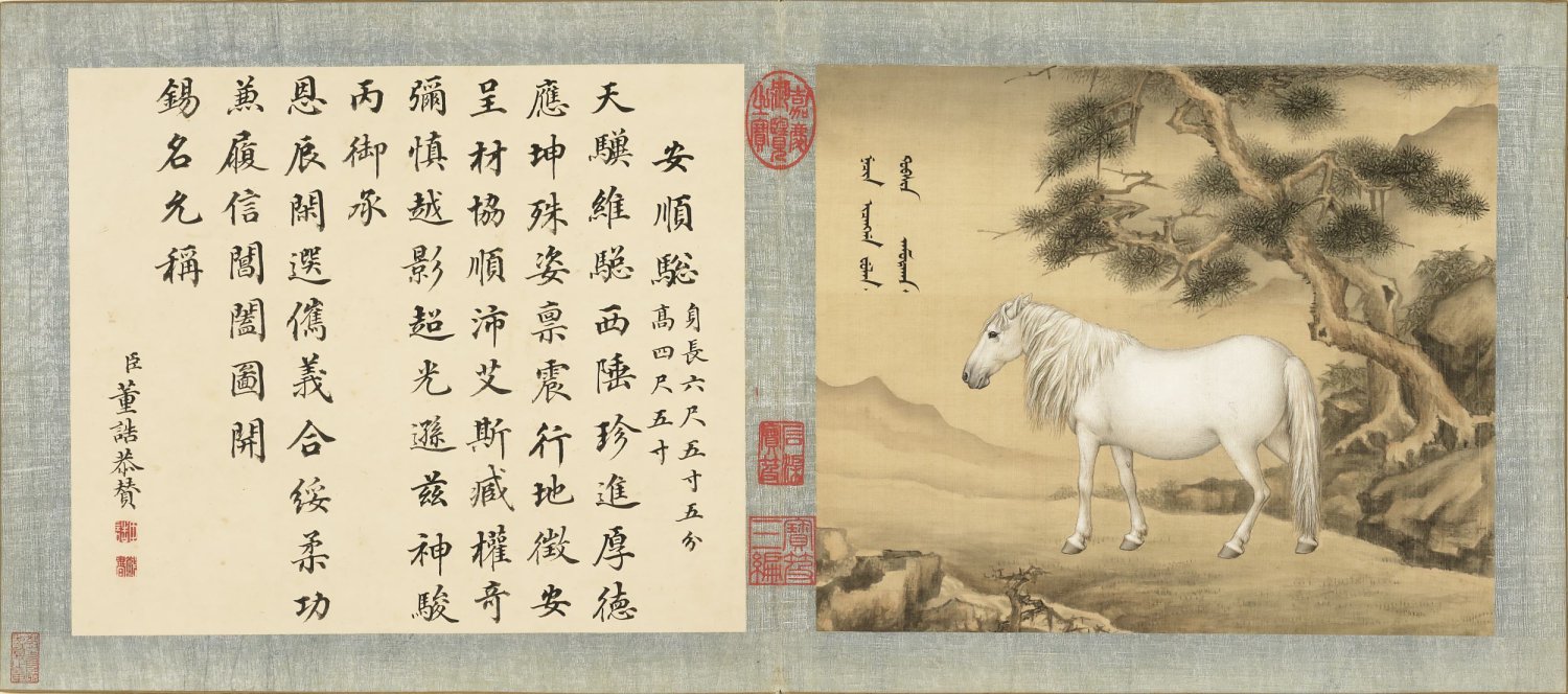 此《御马图》册由清代宫廷画师绘制。全册共十二开,描绘了清内府十二匹从西域或蒙古进呈的坐骑:安端骢、安俊黄、良吉骝、吉云骝、平安驈、安顺骢、安翔驈、庆吉骝、云锦骢、安骏黄、宝花骓、履安骢。左页为清嘉庆十六年嘉庆帝和群臣赞。此册现藏于台北故宫博物院。