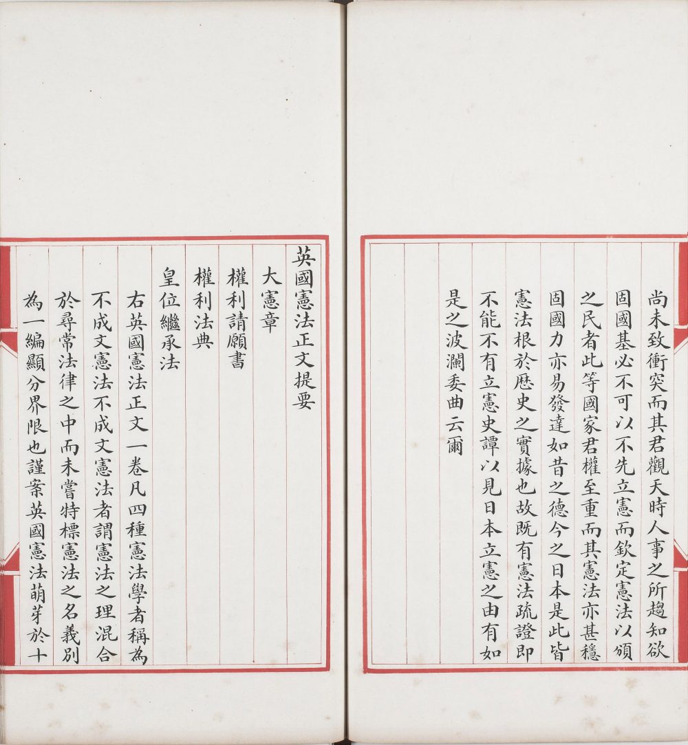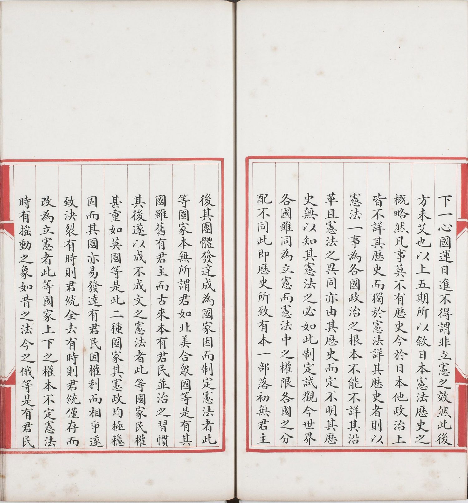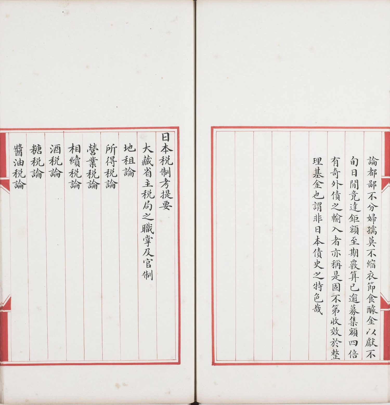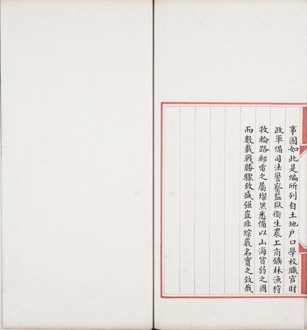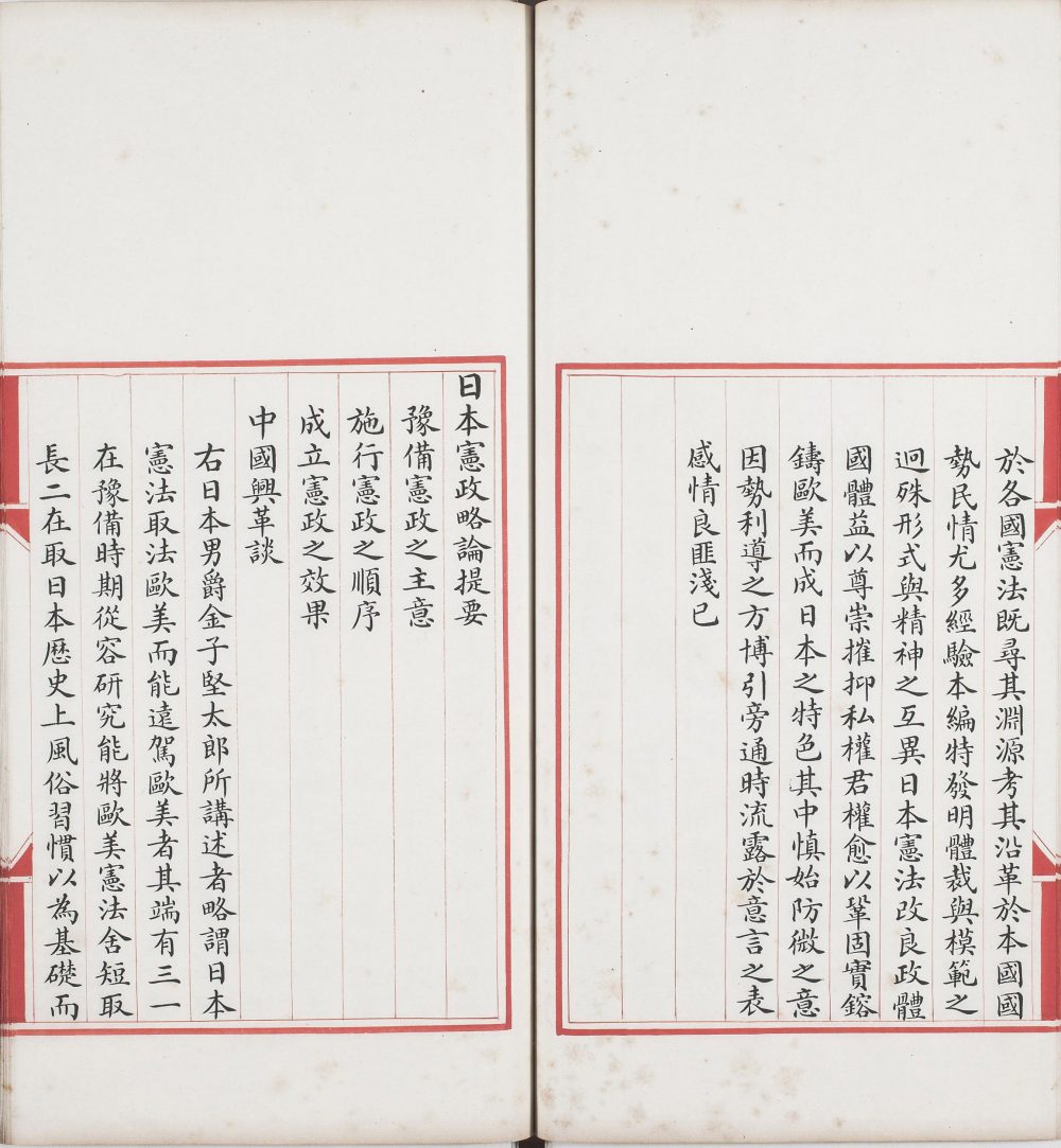 此《政治丛书提要》不题书写者。全书共四卷,共三十种宪政类书籍提要,始于:日本宪法疏证提要。终于:日本统计类表叙论提要。应该是清末预备立宪时期,进呈给光绪皇帝阅读的宪政书籍提要,内容包括:宪法、国会、税法、制度、教育、货币、司法等等。此为清光绪宣统年间内府朱丝栏钞本。