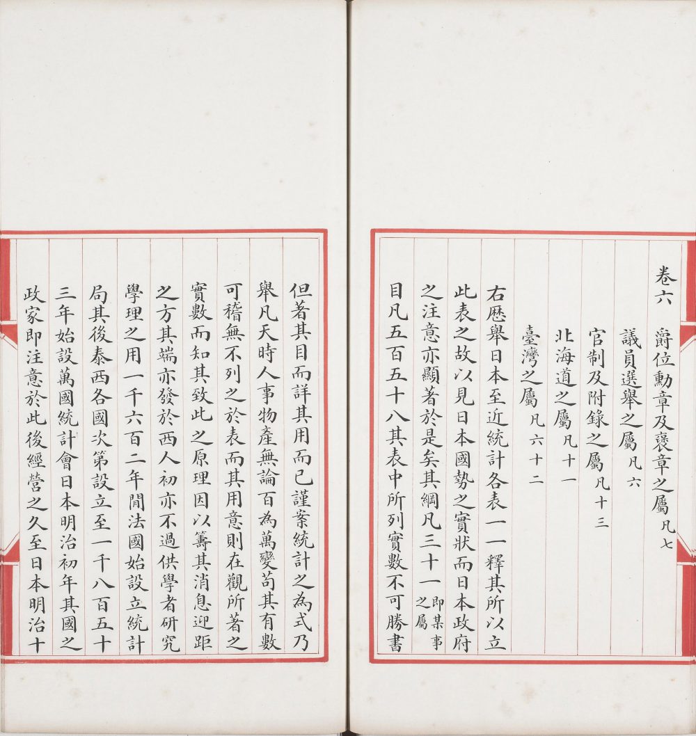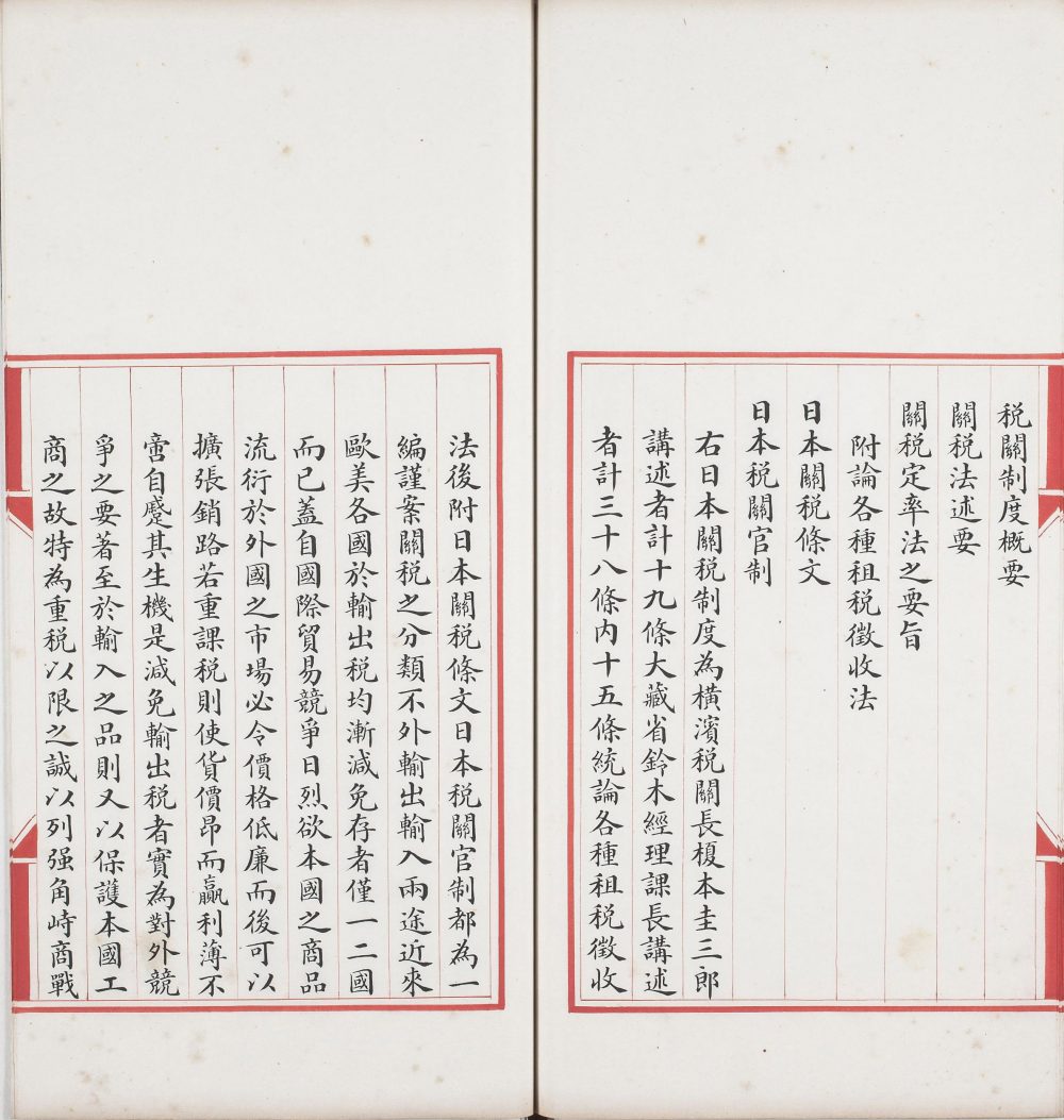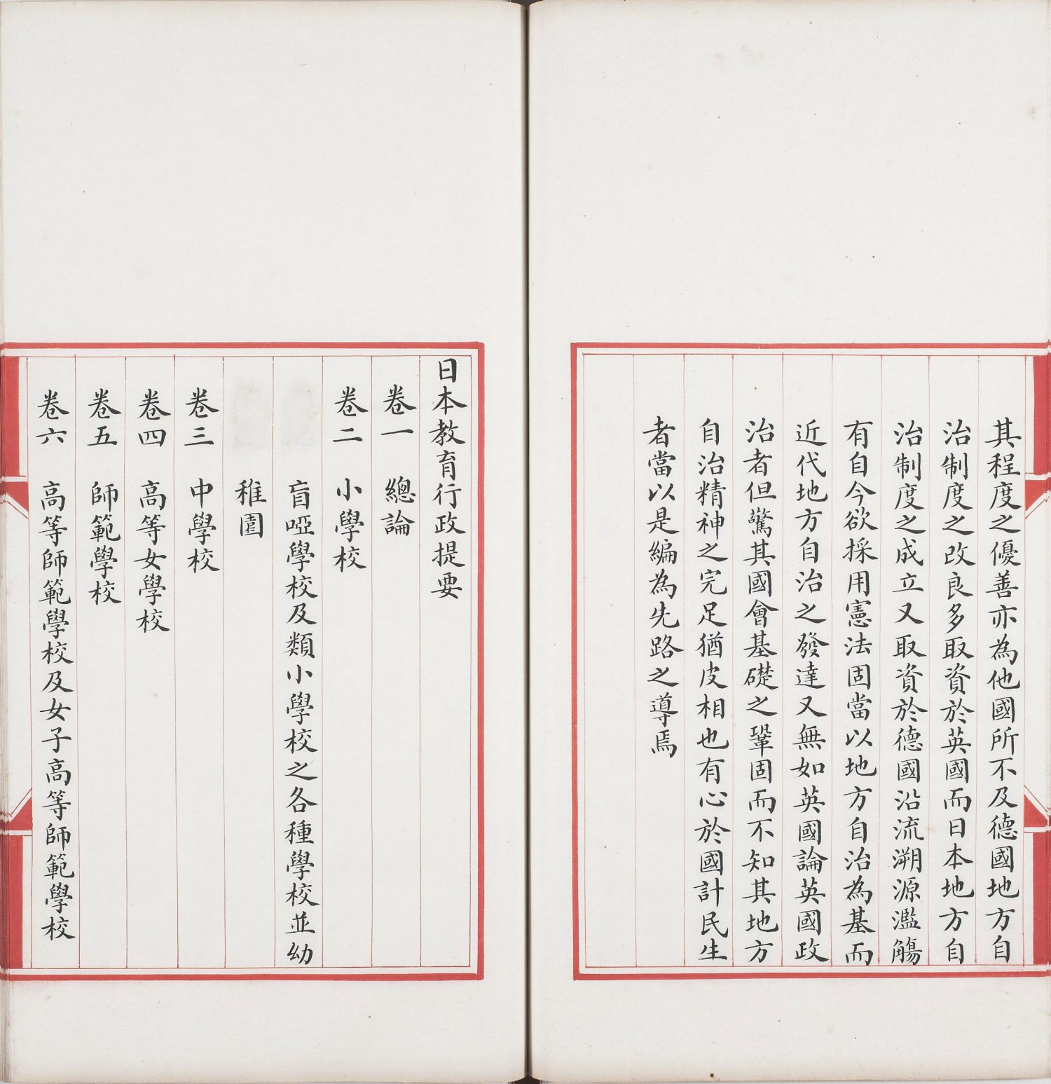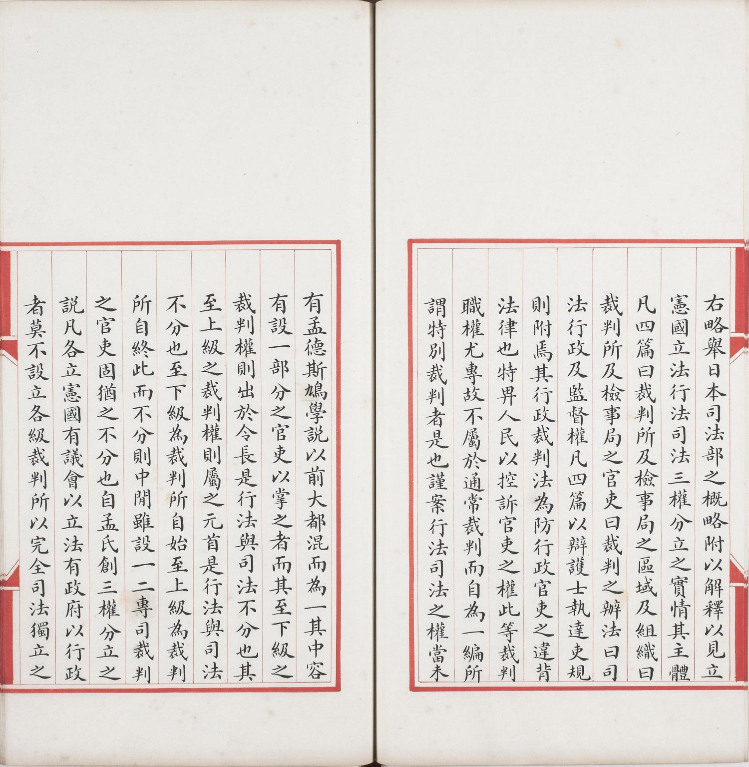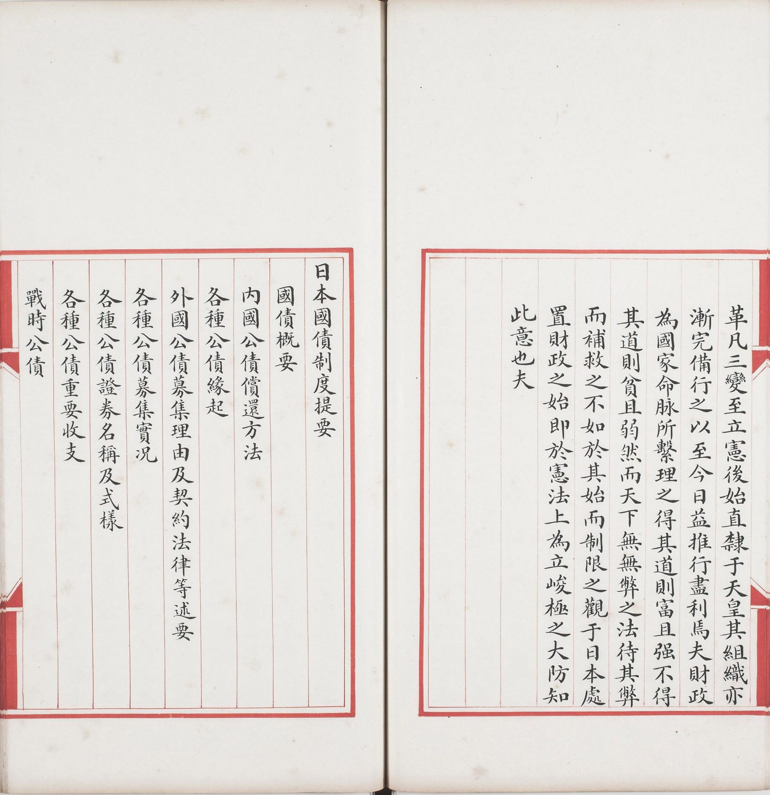 此《政治丛书提要》不题书写者。全书共四卷,共三十种宪政类书籍提要,始于:日本宪法疏证提要。终于:日本统计类表叙论提要。应该是清末预备立宪时期,进呈给光绪皇帝阅读的宪政书籍提要,内容包括:宪法、国会、税法、制度、教育、货币、司法等等。此为清光绪宣统年间内府朱丝栏钞本。