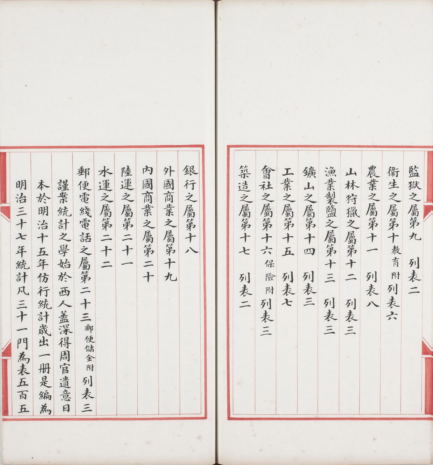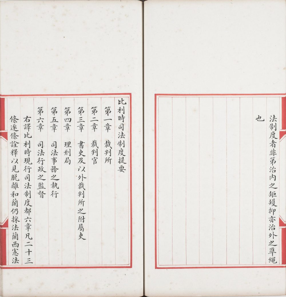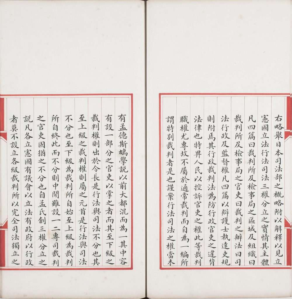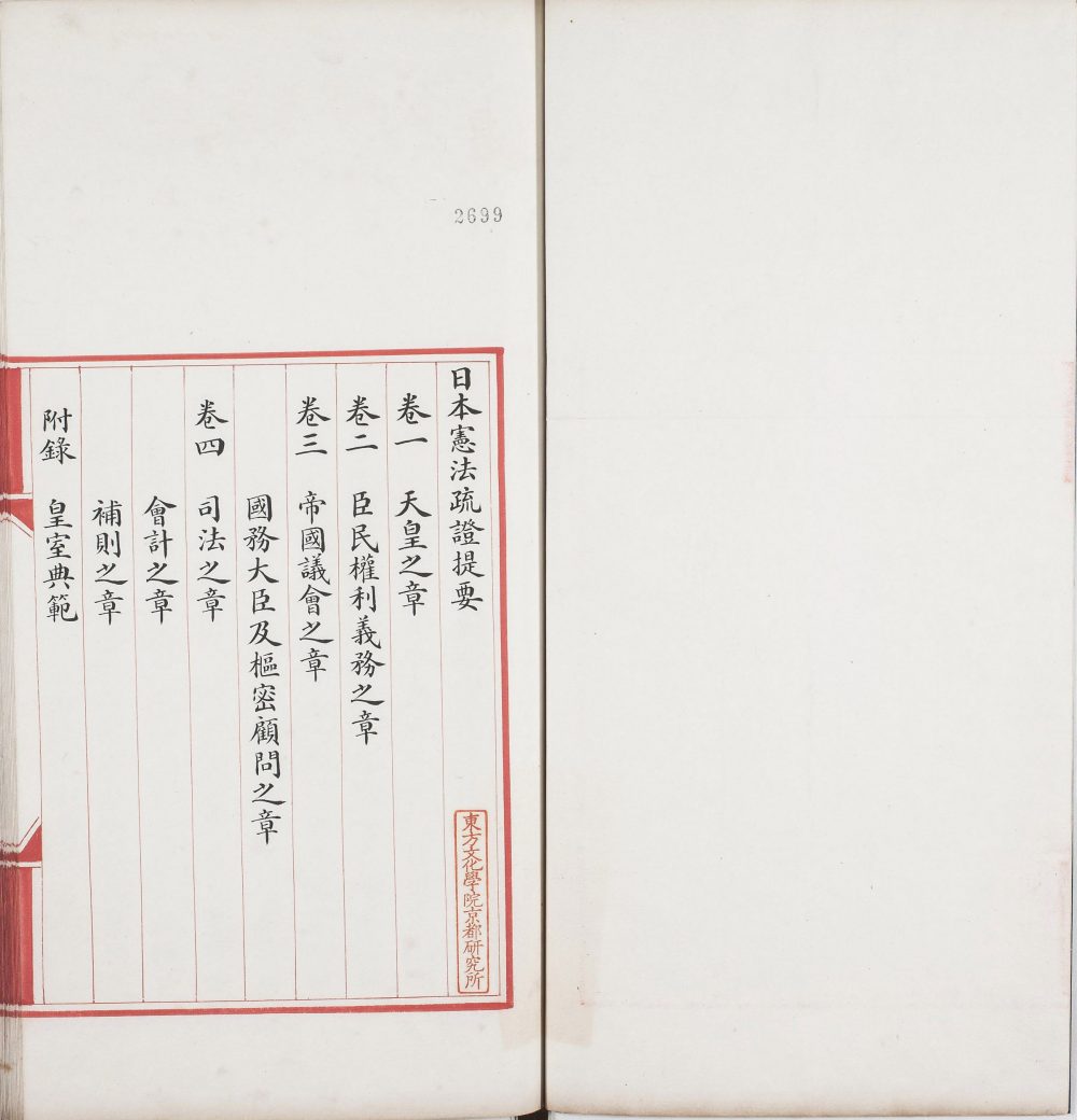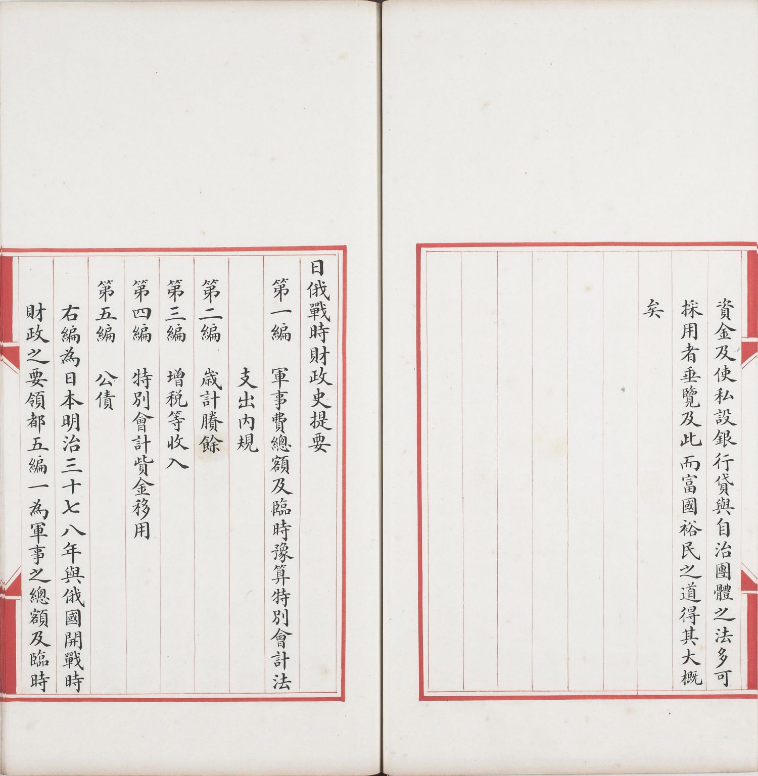 此《政治丛书提要》不题书写者。全书共四卷,共三十种宪政类书籍提要,始于:日本宪法疏证提要。终于:日本统计类表叙论提要。应该是清末预备立宪时期,进呈给光绪皇帝阅读的宪政书籍提要,内容包括:宪法、国会、税法、制度、教育、货币、司法等等。此为清光绪宣统年间内府朱丝栏钞本。