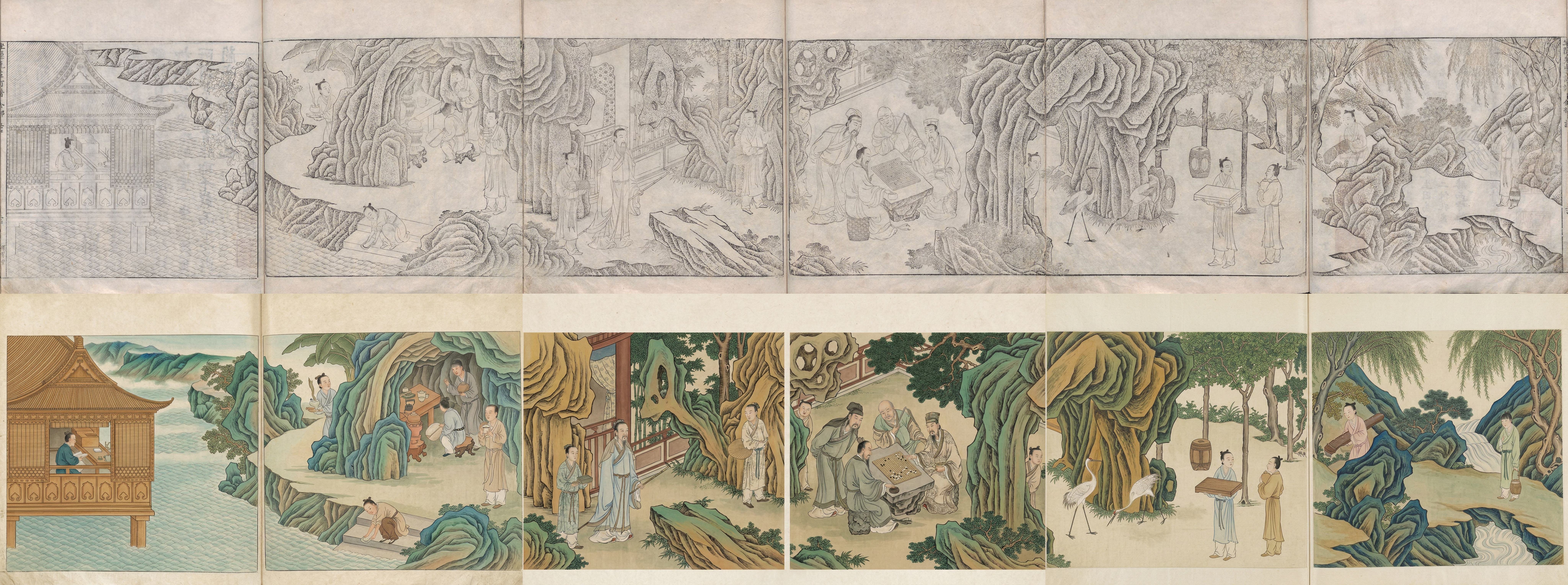 目录前附有一套六面三叶连式长卷版画《坐隐图》,描绘了汪廷讷在环翠堂中与文人雅集对弈的场景,还有有人负手旁观,周围有童子煎茶、洗砚,风景幽雅。