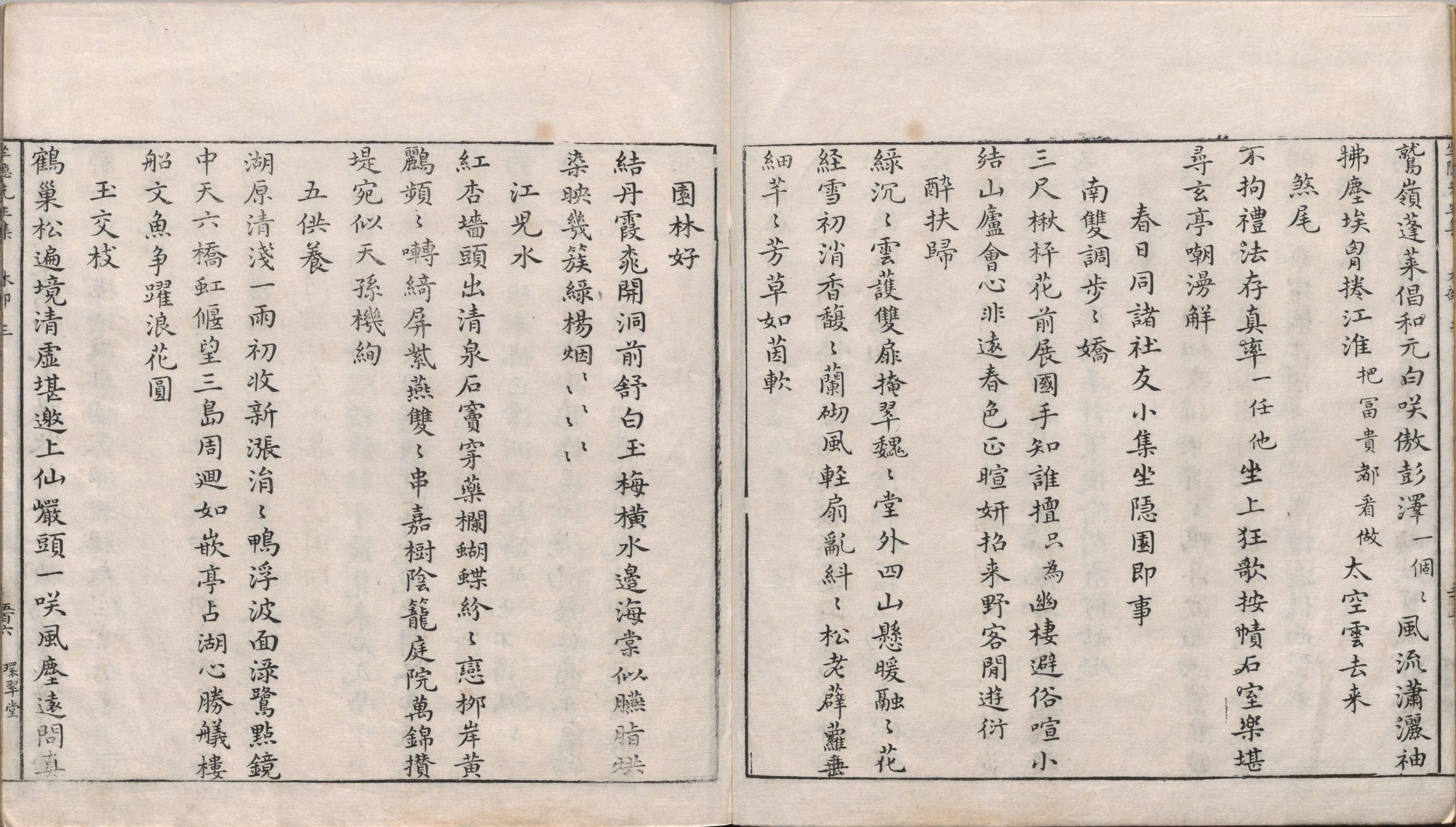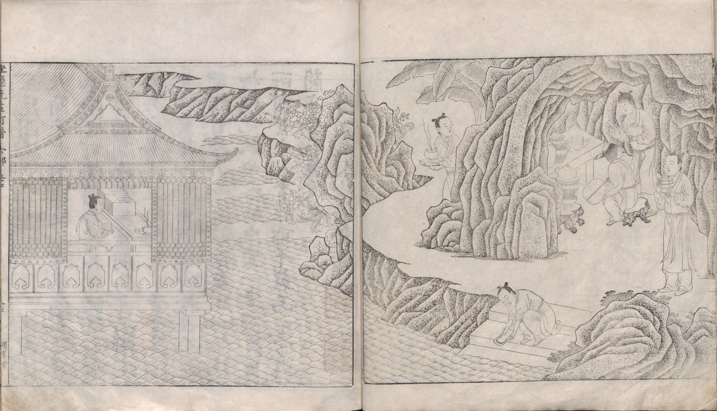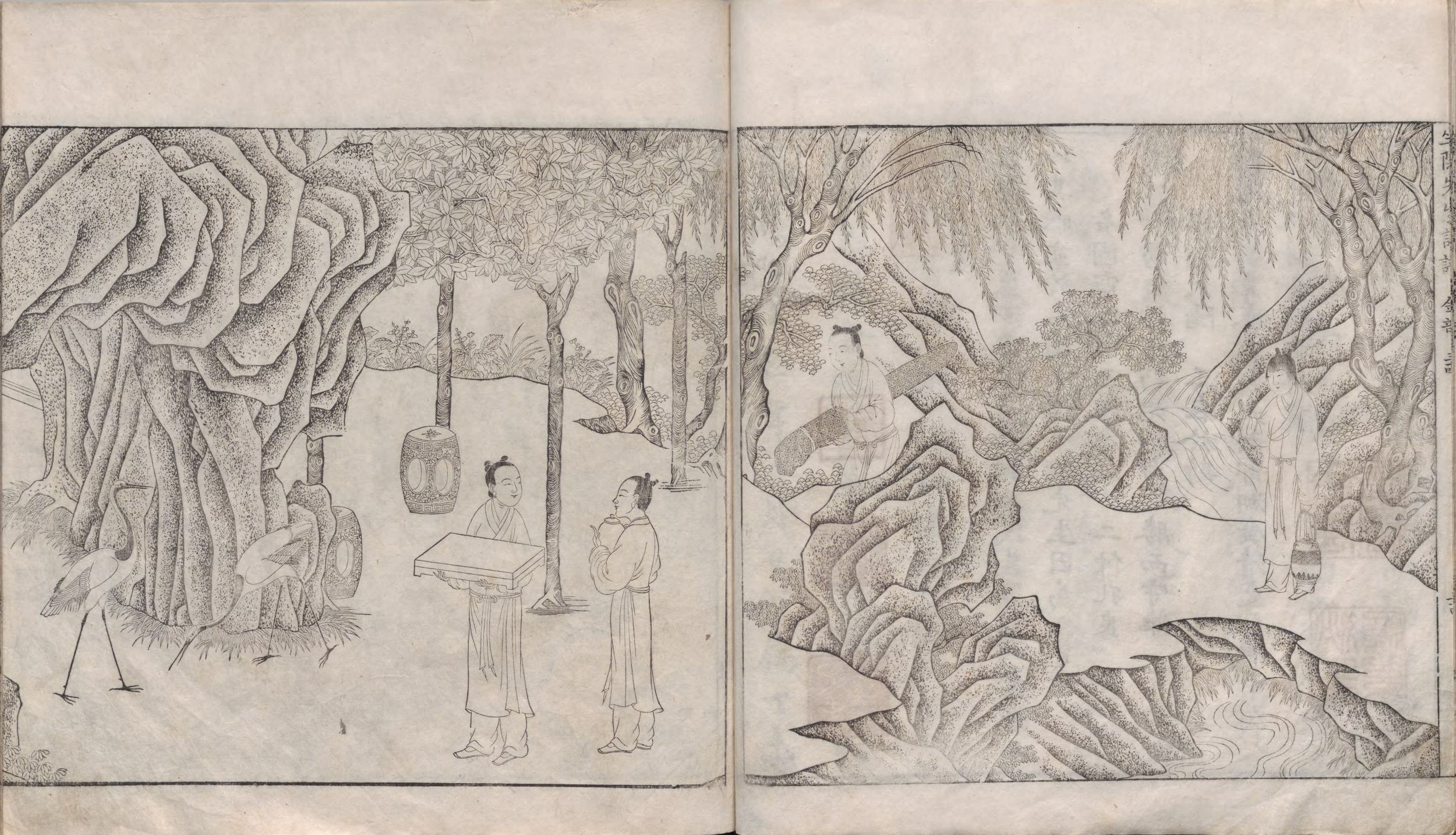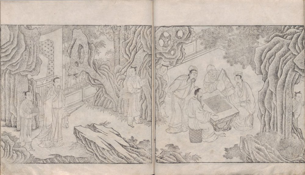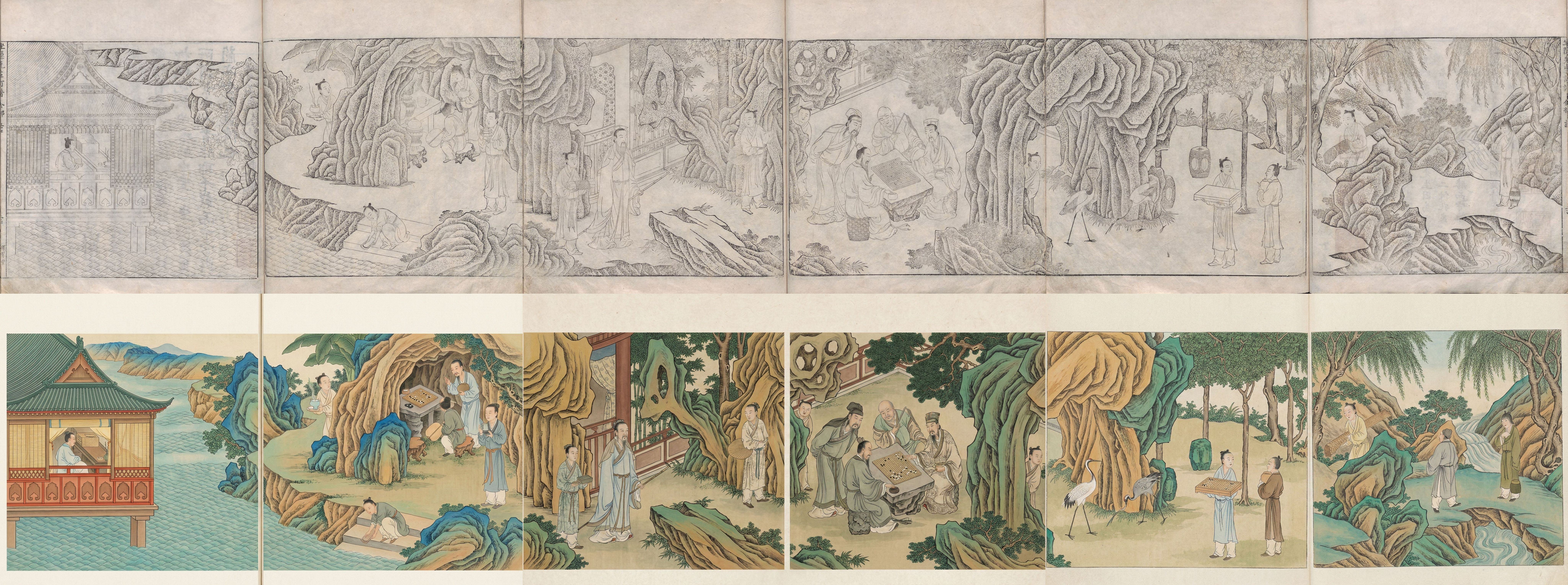 目录前附有一套六面三叶连式长卷版画《坐隐图》,描绘了汪廷讷在环翠堂中与文人雅集对弈的场景,还有有人负手旁观,周围有童子煎茶、洗砚,风景幽雅。