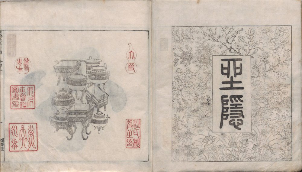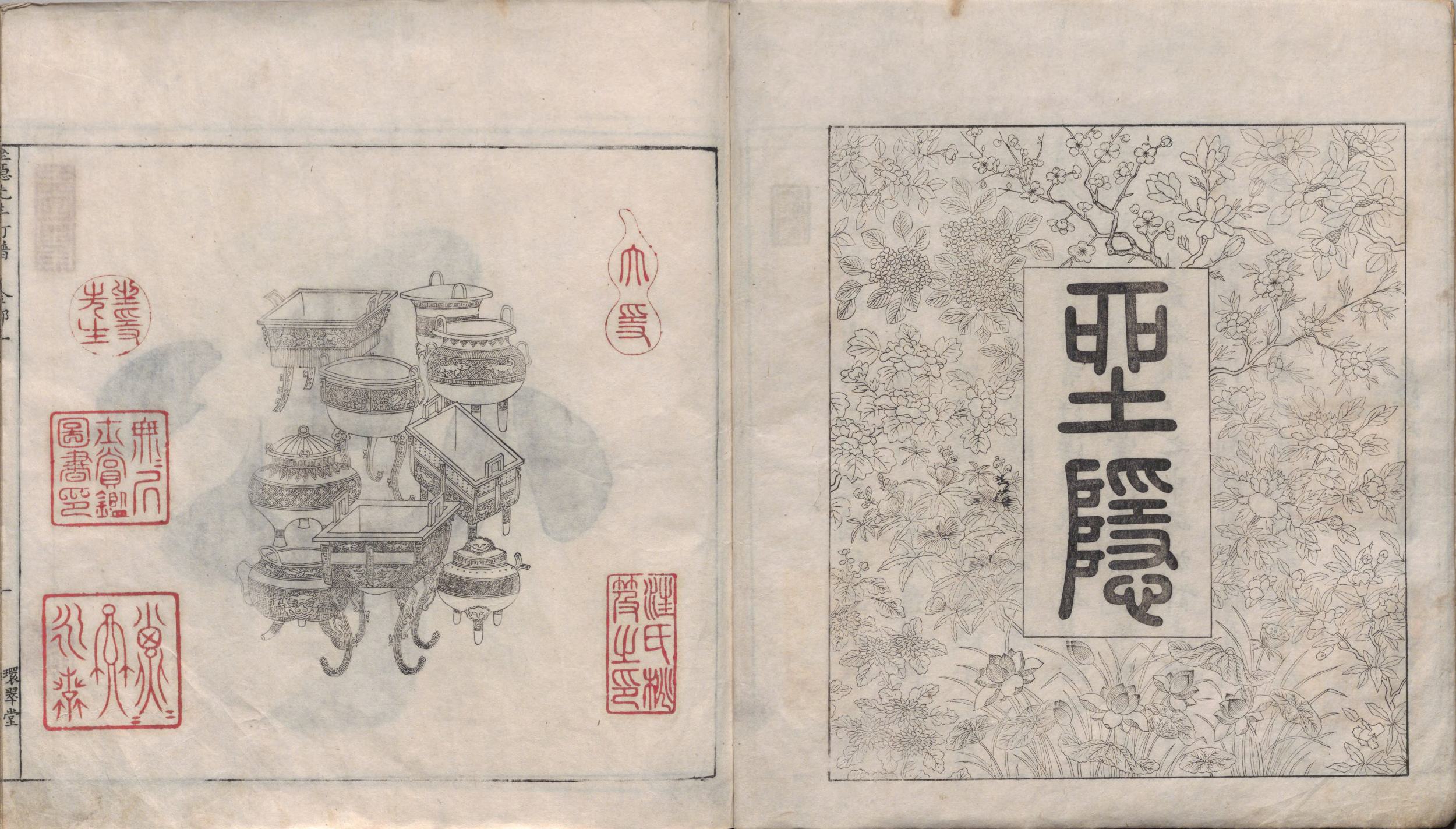 首页居中镌大篆「坐隱」二字,四周饰以桃花、玉兰、牡丹、荷、菊、梅等四时花卉,绘刻精细。后页居中排列九座鼎彝,器型古雅,呼应前文「今刻九鼎為記」。