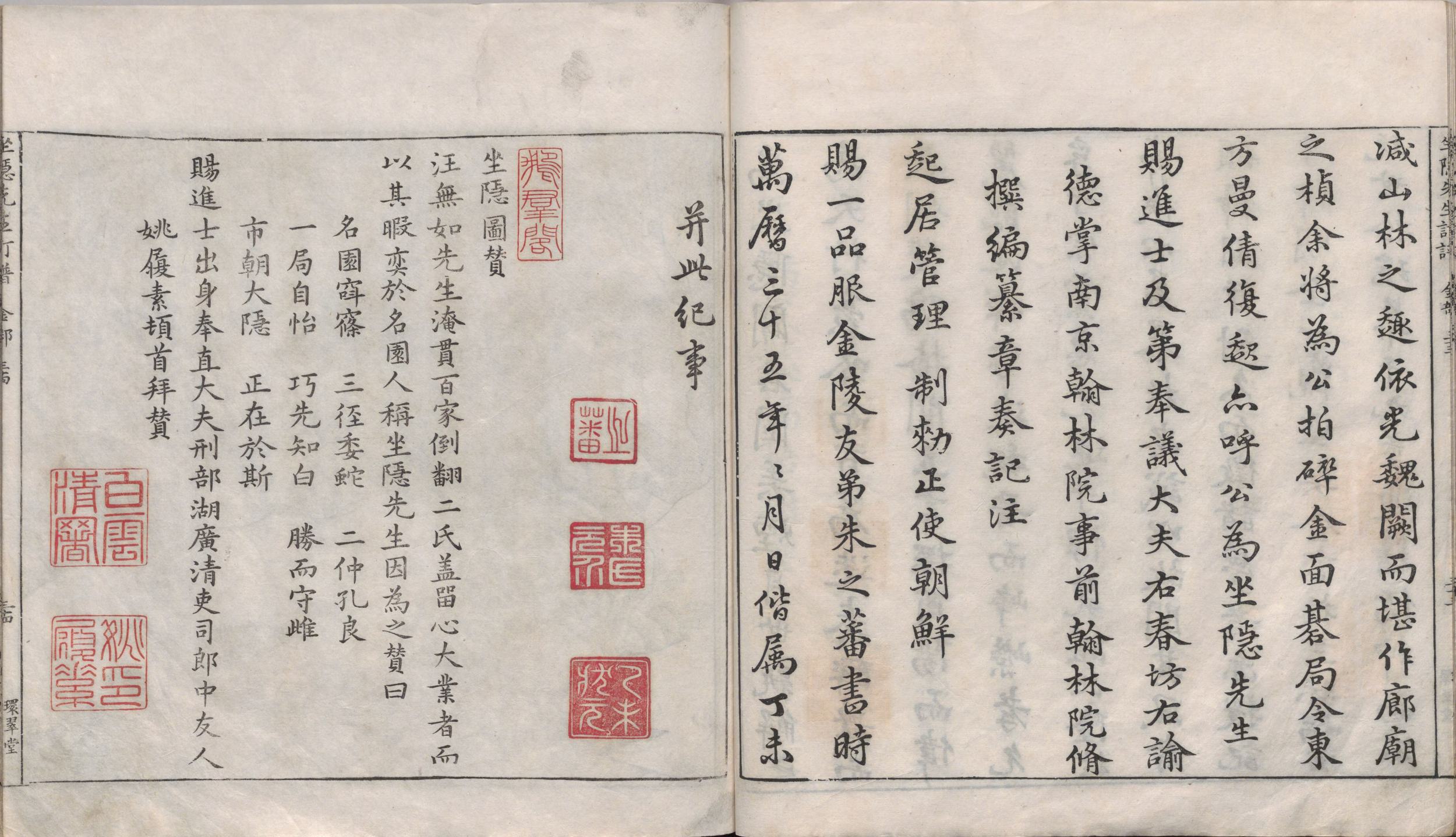 坐隐先生谱集叙(焦竑撰)、坐隐先生订谱全集序(郭子章撰)、汪鹾使 [1] 鹾使是古时对盐运使的别称,专门负责管理盐的运输和销售。 坐隐订谱全集序(程朝京撰)、坐隐先生订谱题辞(袁福征撰)、叙汪鹾使坐隐先生订谱(金继震撰)、坐隐先生订谱序(李自芳撰)、自叙(汪廷讷撰)、坐隐先生传(顾起元撰)、题坐隐先生传后(林世吉撰)、书坐隐先生传后(梅鼎祚撰)、坐隐先生赞·有序(朱之蕃撰)、坐隐图赞(姚履素撰)