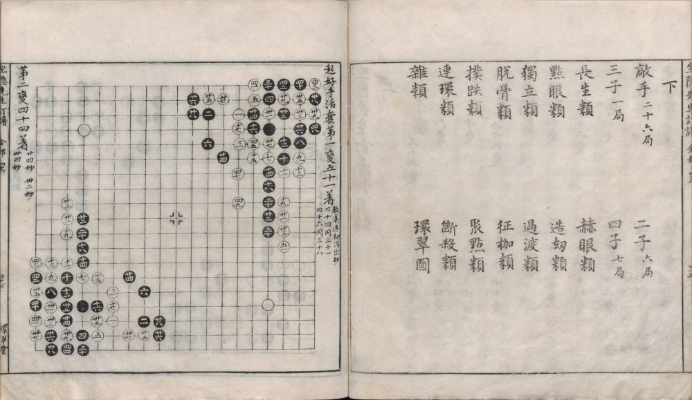 下卷(重实战与死活): 收录了让子棋(如对手、二子、三子、四子局等),以及大量分门别类的死活题和手筋,如 “长生类” 、 “赫眼类” 、 “征枷类” 、 “扑跌类” 等。其中还收录了一局棋谱名为 “环翠图” 。