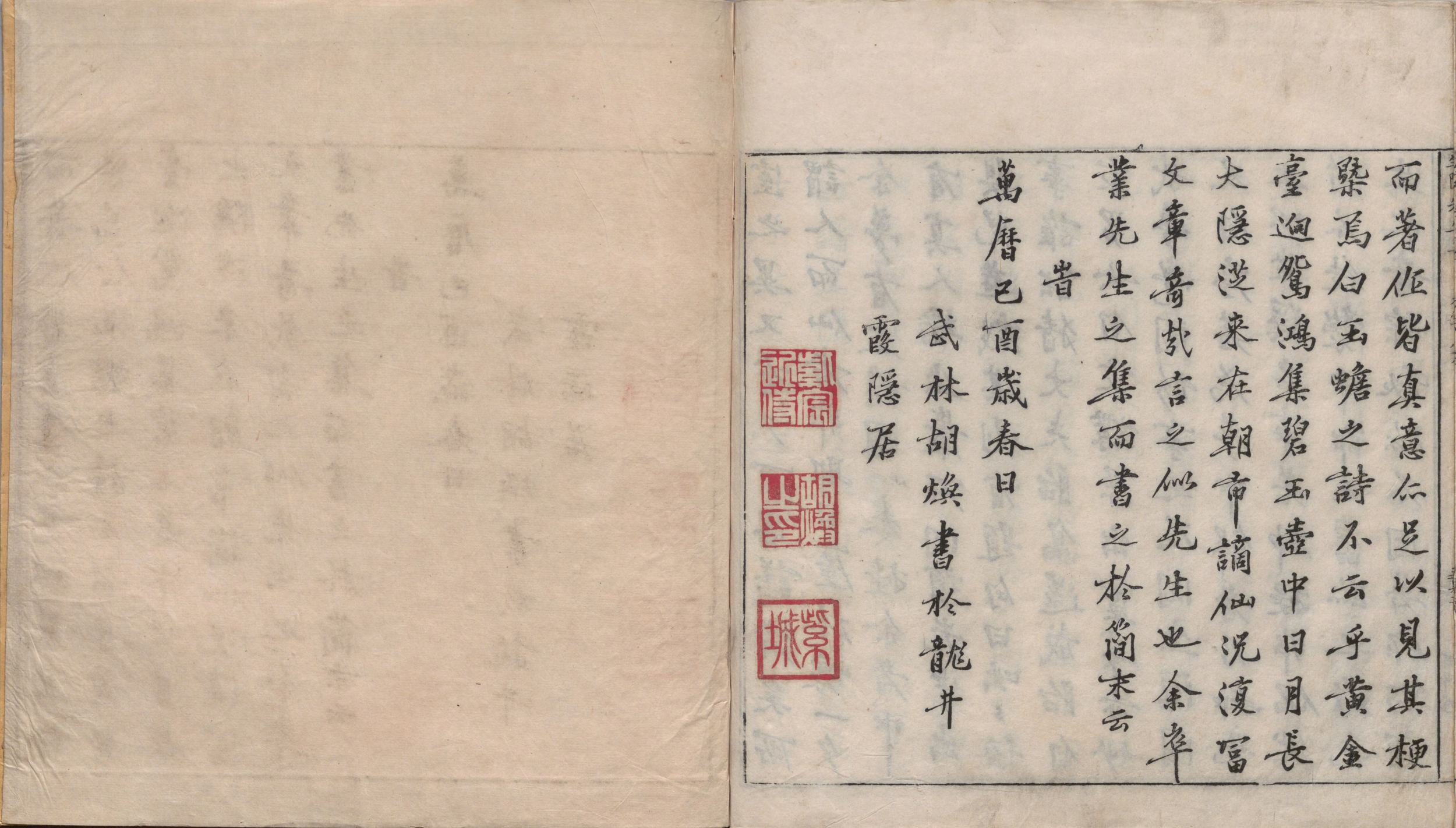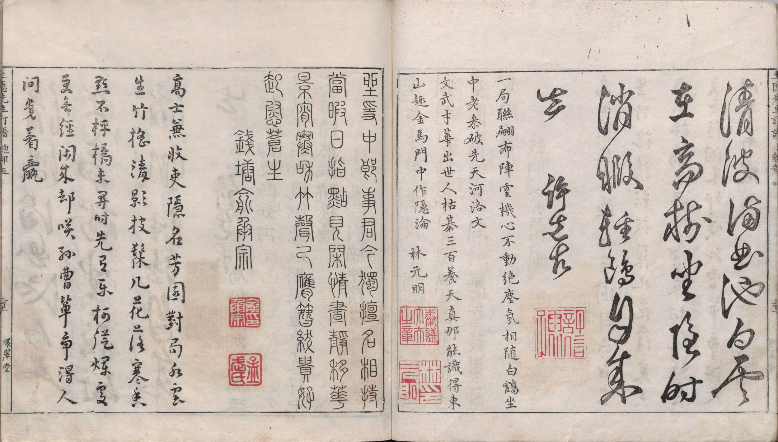 本堂刻行訂譜,細心校讎,點畫無魚魯之訛。重直雕鏤,體制有晉唐之遺。簡良工而聚業,歷歲月以成集;既專且久,誠都以麗。恐有無知之徒、罔利之輩,假名目以妄梓,希混淆而欺世。潦草錯誤,悉便覽讀;具雙目者,必能鑑定,徒任耳者,或至受誣。誠本堂之深恨,實士林之共憤。今刻九鼎為記,尚冀買者辨之。萬曆己酉孟秋乞巧日,新都環翠堂識